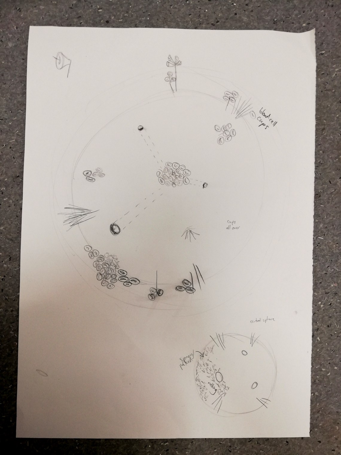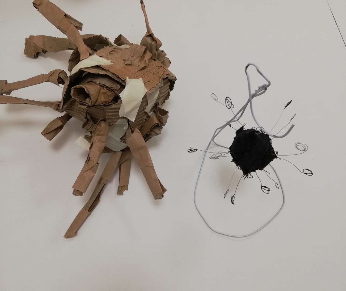 Based on the drawing we made of the object’s description, we moved on to creating cardboard sculptures, using only corrugated cardboard, paper, masking tape and gum tape. Because my drawing was kind of piecemeal, I focused on incorporating aspects of it into the sculpture: I planned to convey the textured surface of the sphere, the tubes going through it, and the strings/spikes with the curved structures on the end. I struggled with the gum tape not being strong enough to secure the tube ends I wanted to stick to the surface of my sphere of cardboard, and with the masking tape not being strong enough either. I decided to weave cardboard strips through a main piece of cardboard (using an adapted crochet-type technique from the orange Vin+Omi jacket), so as to be able to both keep the wrinkly cardboard texture for the surface and have something to attach the spines to. I also tried to attach the surface pieces of cardboard to the sphere using loops of masking tape, hoping to preserve the external texture and appearance, rather than sticking masking tape all over it.