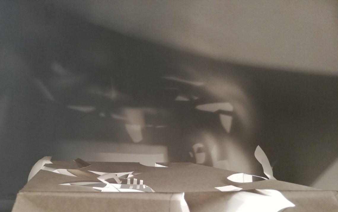 For the final phase, we used the abstract drawings as a base to choose and trace some lines on a new sheet of paper. We then cut the lines to create shapes that would fold out, folded the paper to make it stand, and put light through the whole thing to see what new shapes would be created. As the light moved the shadows it was kind of unnerving to find myself recognising shapes like birds and faces: to notice my imagination working to interpret and translate the images yet again.