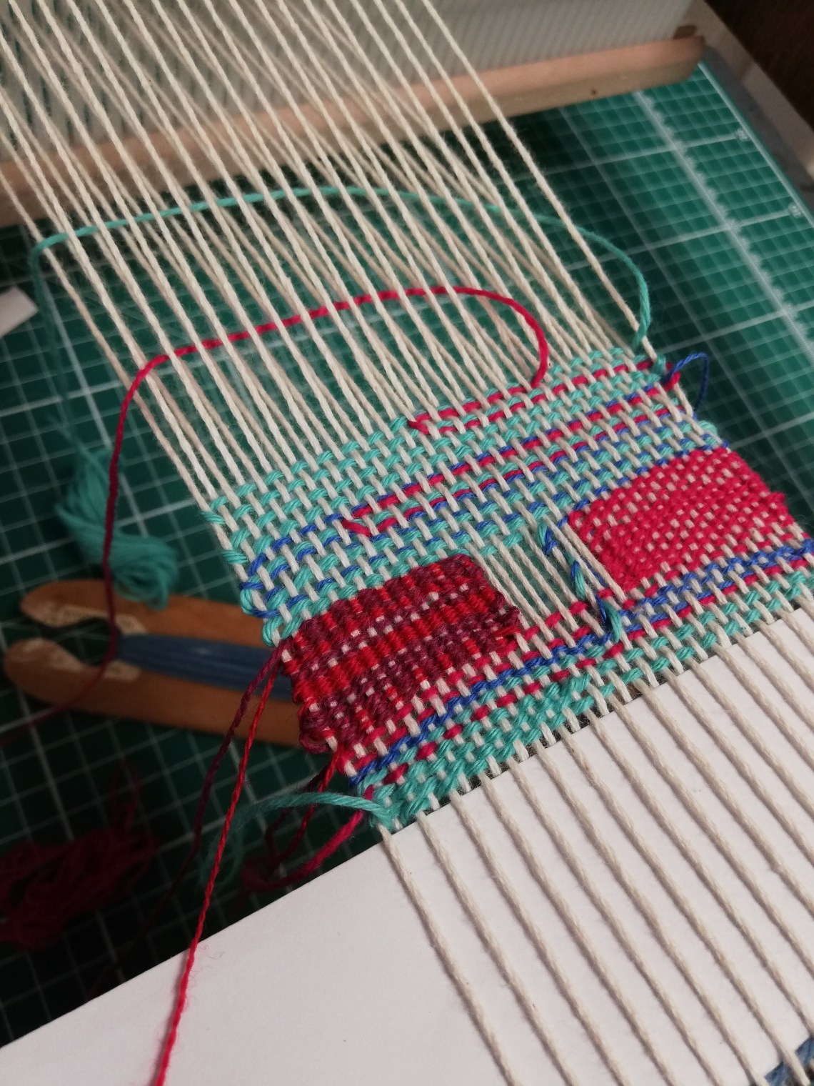 Want to spend some time practicing the basics (eg just plain weaving with one weft and making sure to get it lying flat and straight) and maybe some of the specific weaves (twill, basket etc). For the latter I’ll probably have to use the larger loom and check the warps are strung to the right sheds in order (I think some of the 2s and 4s get mixed up halfway through?), as well as get some patterns from Lucy. Although maybe I could do the patterns by hand without the larger loom? Time consuming.