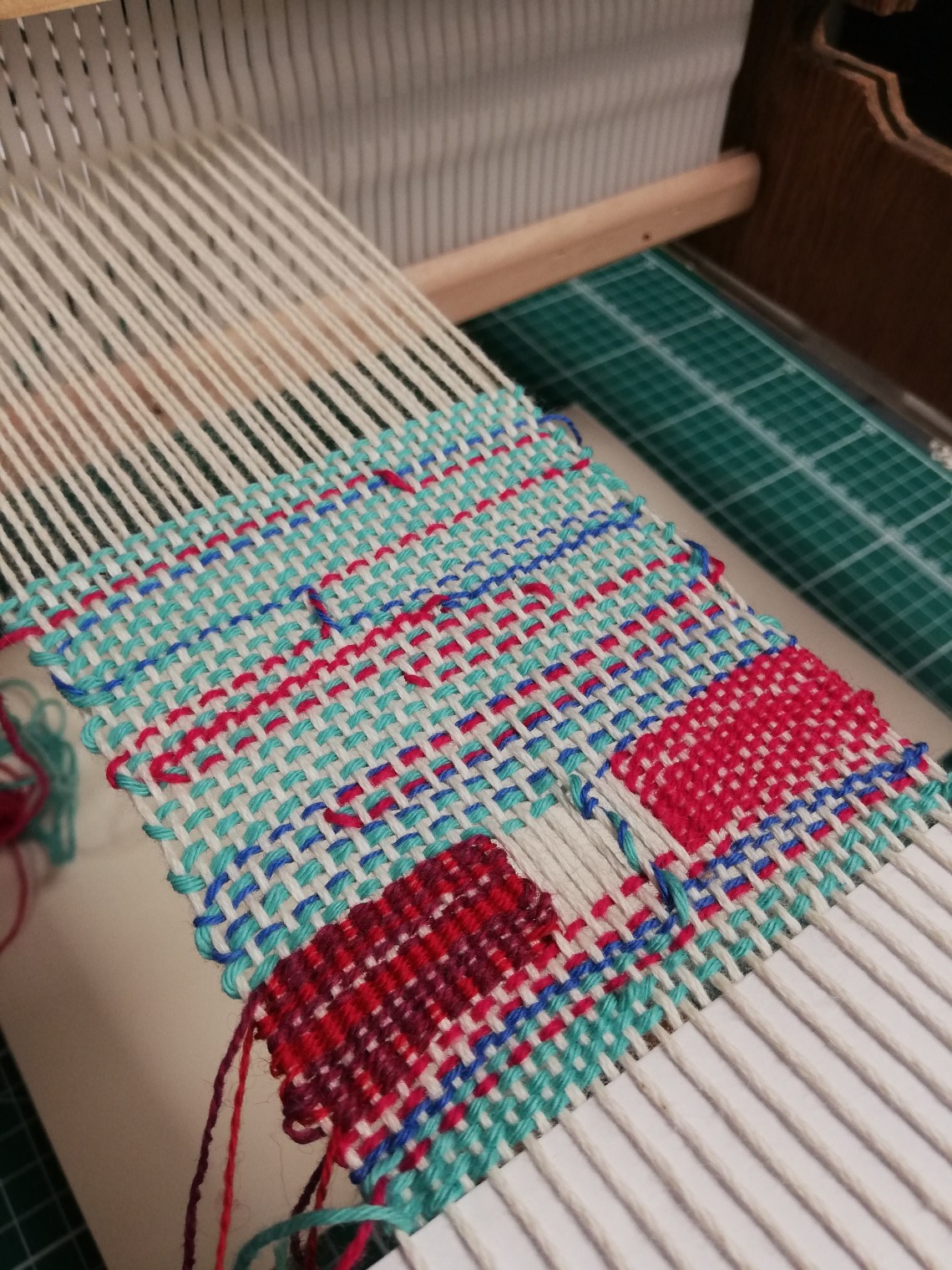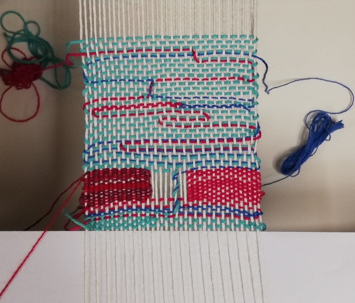 Really love the effect closer to the top of my piece, using a few different colours of weft simultaneously and doing meandering paths that pass over the top with some of them. Also, twisting 2 of them round each other (visible in photo below).