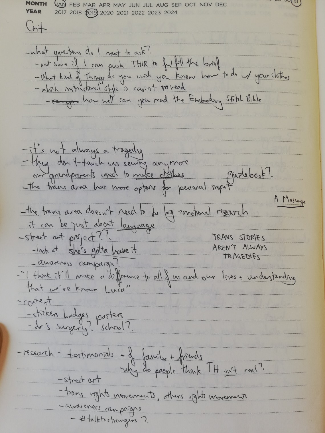 Upon evalutation and group input, the trans area/idea can be more productive more quickly than the sewing guides, and there are ways I can do it that mean I can handle it emotionally. Changing direction to an awareness campaign that tries to blast back against media portrayals and remind people that trans stories aren’t always tragedies.