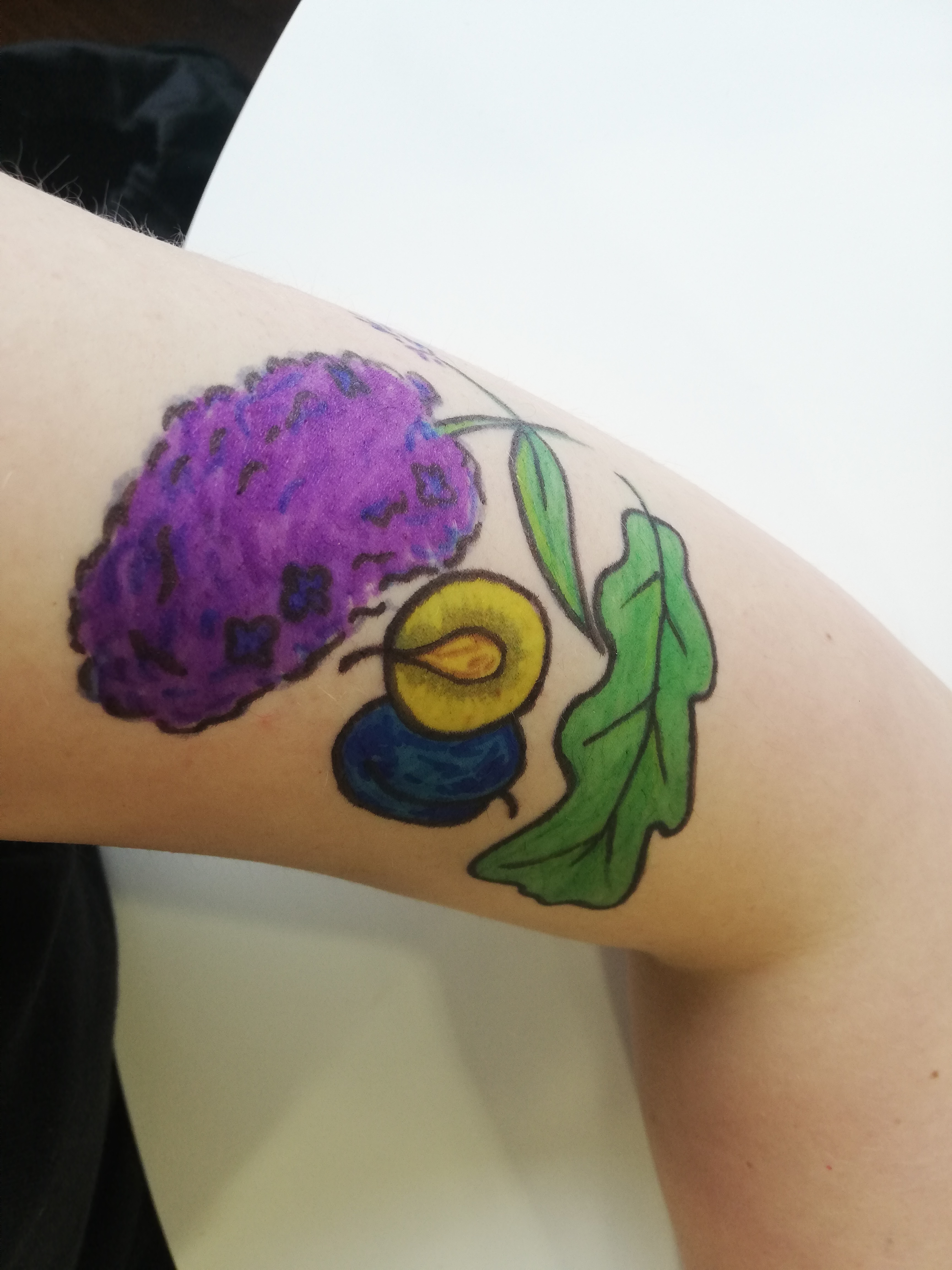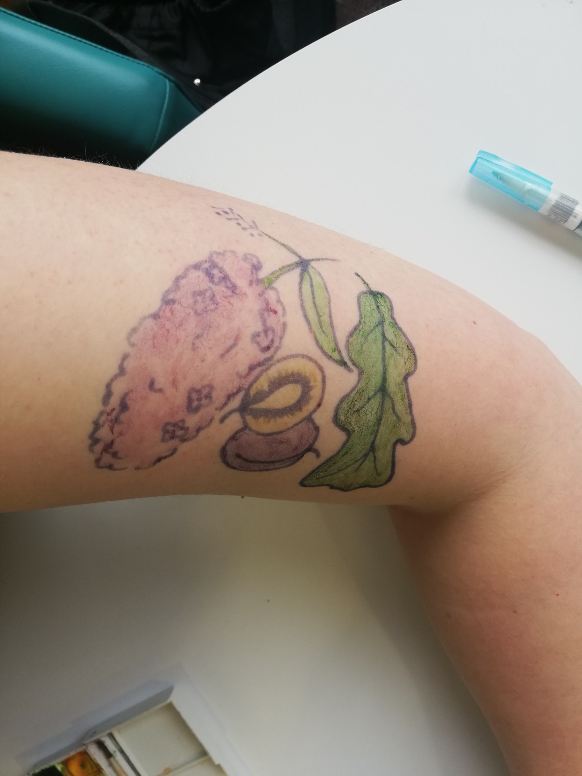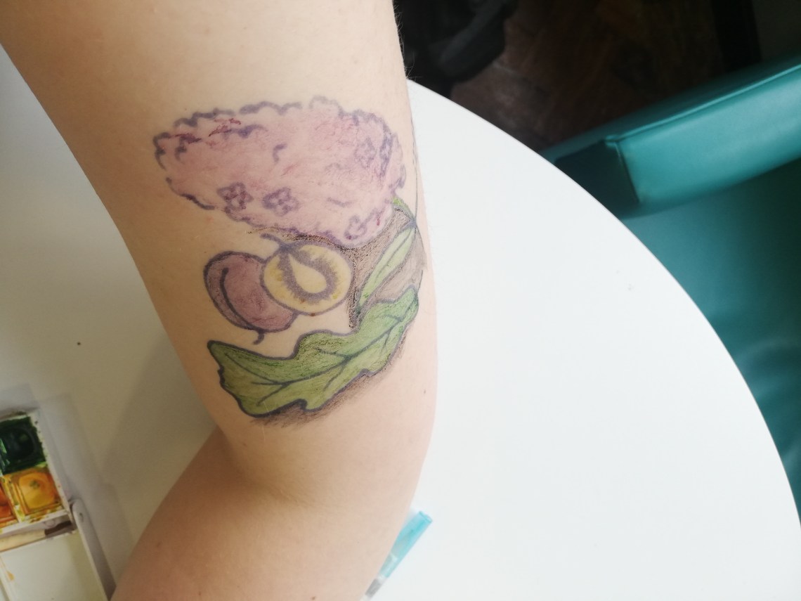 The colour is delicate, which is kind of appealing for individual Tattoos. But I think for a large area with lots of different plants, brighter and more distinctive colours is more effective, because it contrasts and identities the plants more clearly.