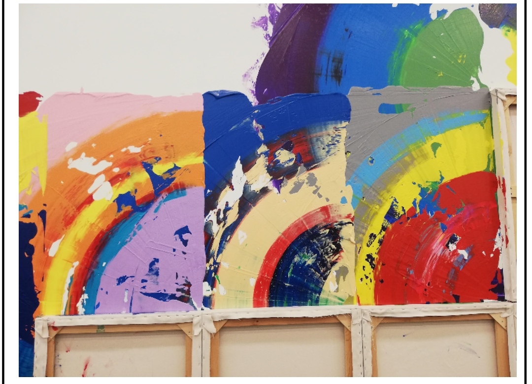 I love the textures and patterns created in the colour by the thickness of the paint, and the apparent role of chance in how exactly the piece turned out. The behaviour of the paint. Also, the implication of huge movement (the spinning of the canvases on the wall) feels very dynamic. Plus the gorgeous huge range of vivid colours. The work just feels BIG to me on multiple levels.