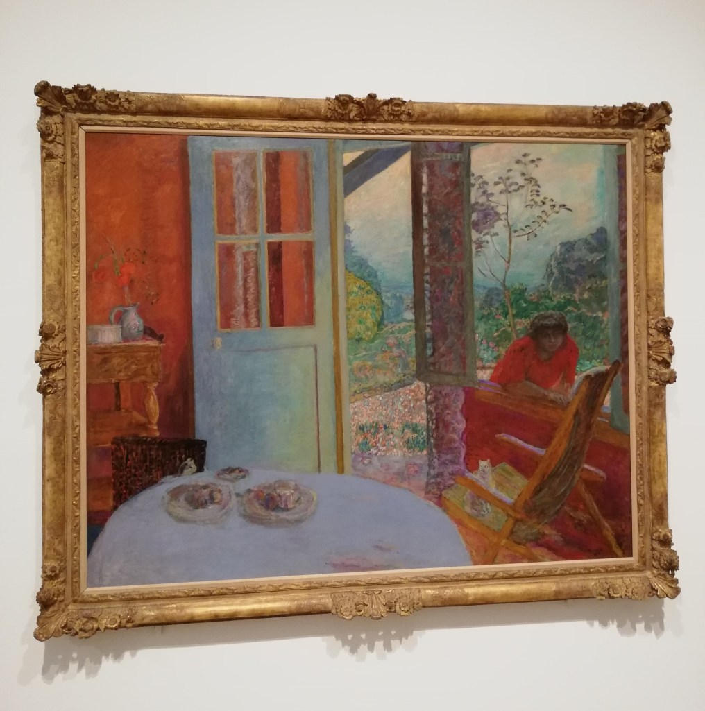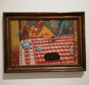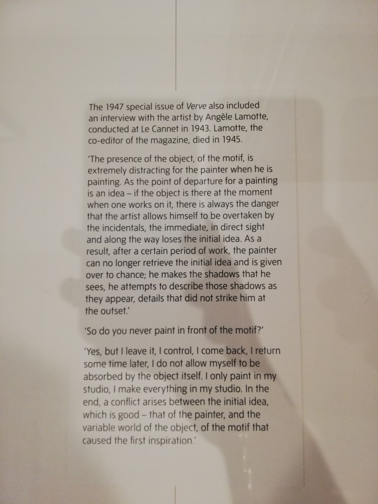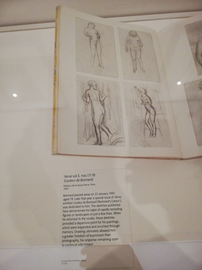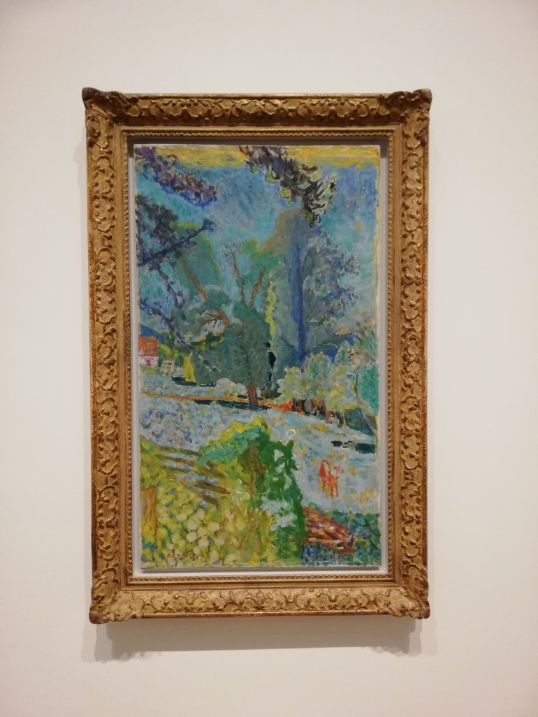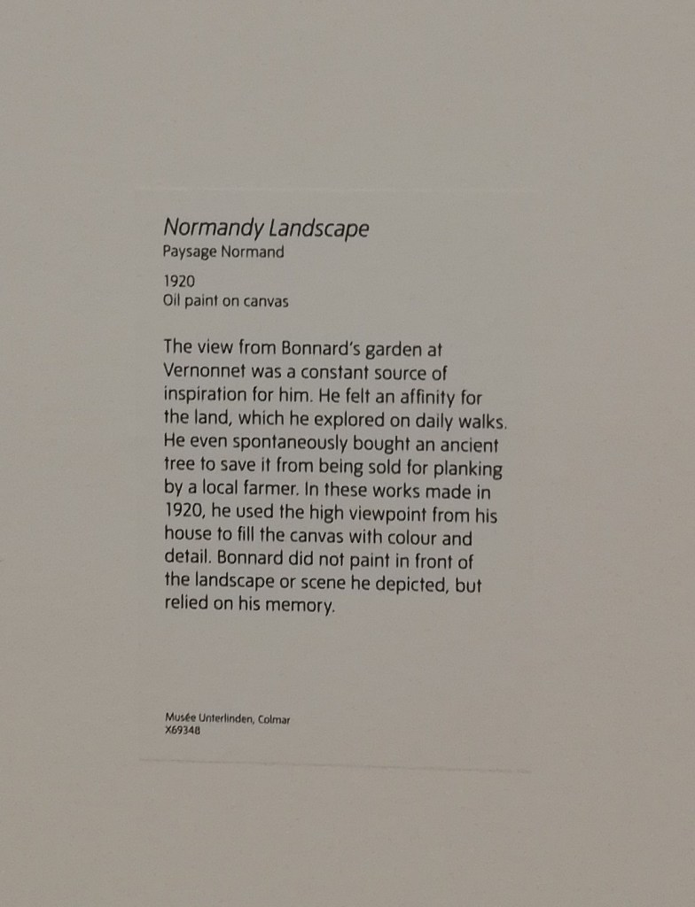 Working method: Bonnard would work on multiple canvases at a time, on canvases just pinned to the wall (not stretched on a frame), so that he could roll them up to transport them and thus work on them for many months (or years) at a time in a variety of environments. ‘This meant that the canvases developed as independent and self-contained entities. Whether addressing the domestic interior, still-life, or landscape, Bonnard needed to summon the experience up in memory, making him acutely aware of the passage of time.’ [quoted from the exhibition booklet] It also means the paintings contain layers of influence from a variety of multiple contemporary environments to the action of painting. Painted through the prism of memory and of multiple contexts.