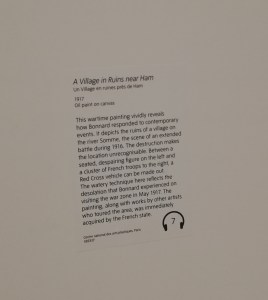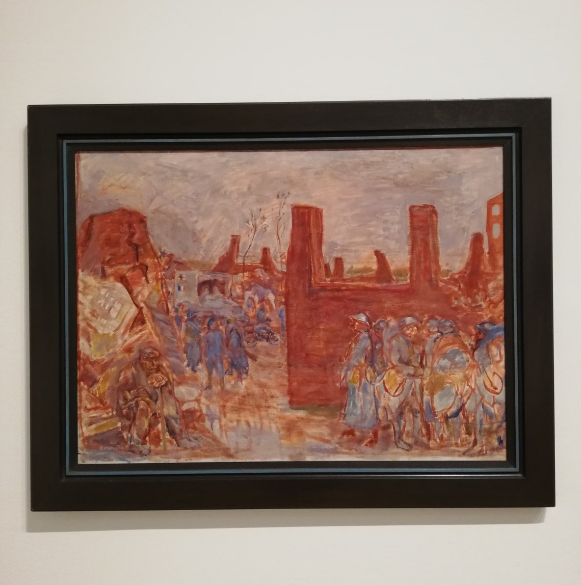 Very interested in the contrast between two paintings from 1917: A Village In Ruins Near Ham and Summer. The concept of both painting records of ruin and destruction at the same time and trying to depict a ‘vision of peace that all hoped was to come.’ Depicting crisis and hope simultaneously. You don’t have to pick whether you are an artist who depicts cruel reality or an artist who depicts only naive peace and hope. Also, I feel that I understand/relate to the emotional colour palettes in these paintings: blues, greens, peaches for peace, reds and purples for war and destruction.
