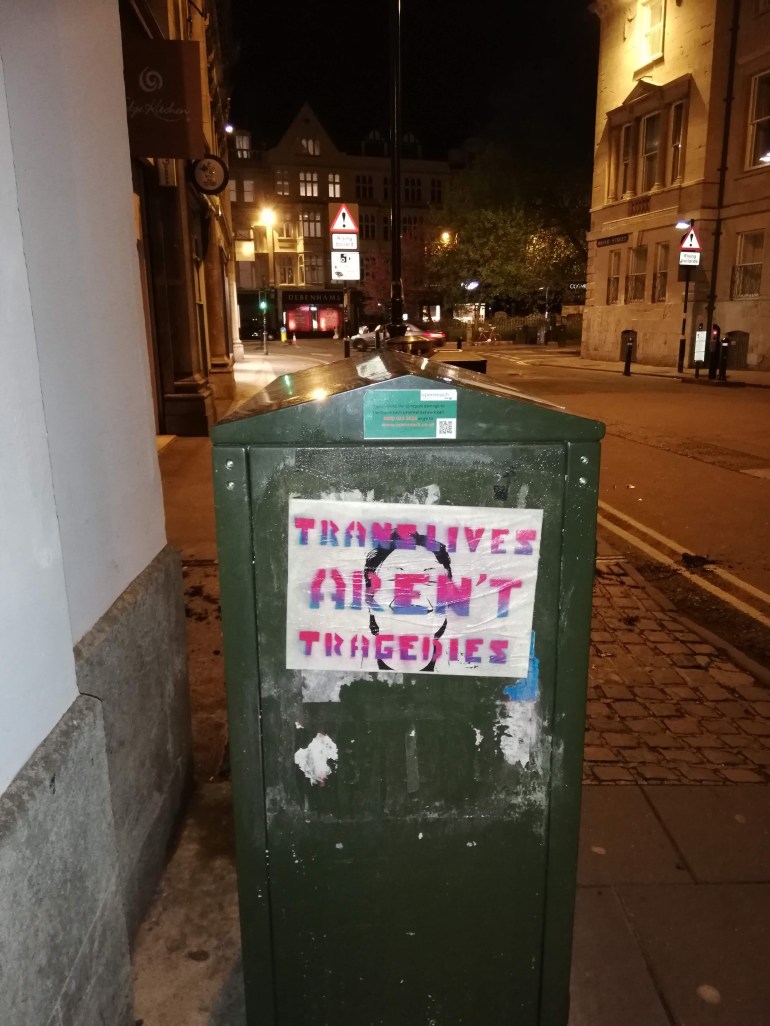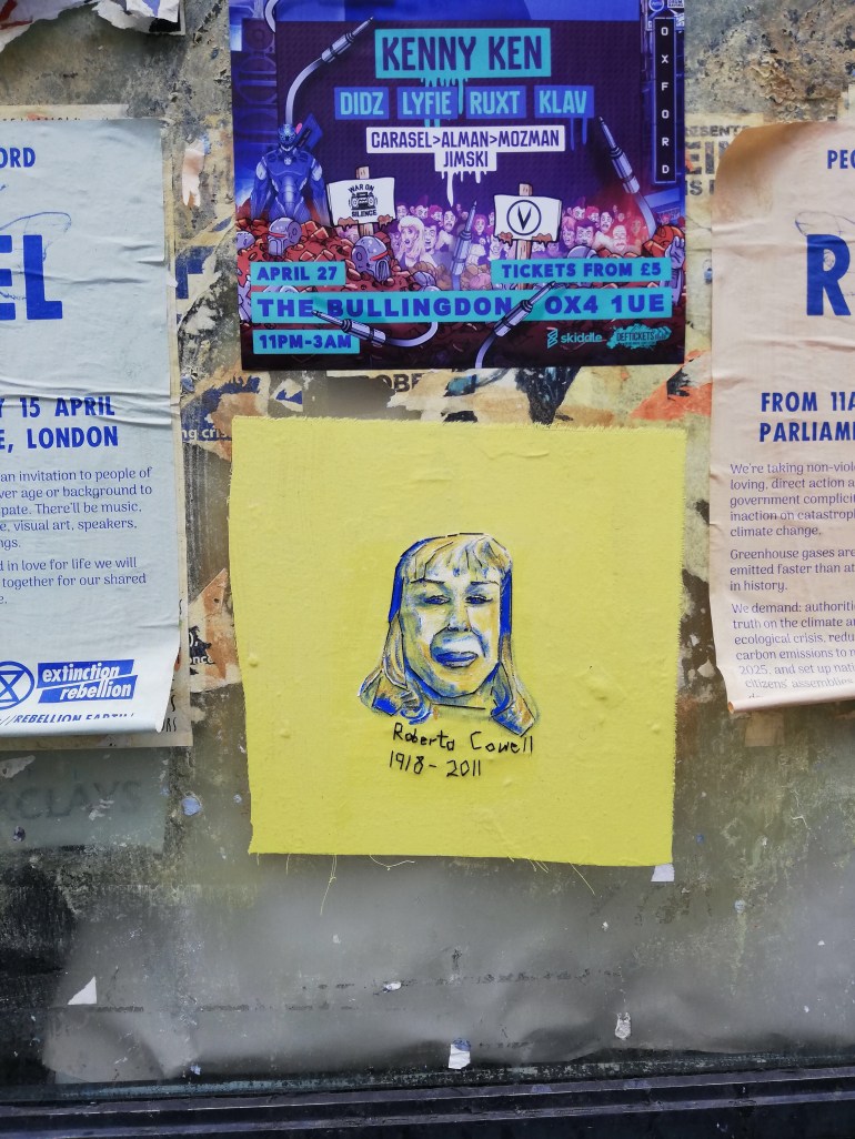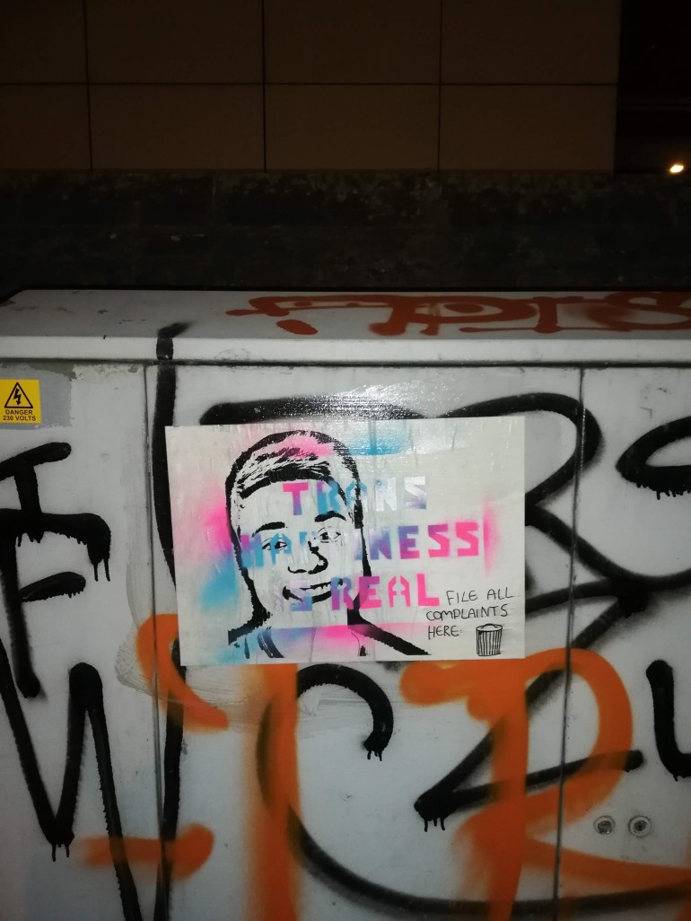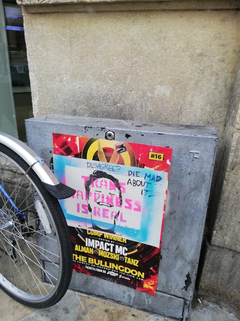 The diagonal stripe on the colouring effect, although appealing out of context, actually works to break up the words and make the message less eyecatching and even less legible. Silver stripes are the hardest to read, and also reduce legibility even horizontally. I think these issues are compounded because the words are over the white/black background of the faces, because I didn’t have the same silver legibility issues when striping the words directly onto dark backgrounds like bins in Temple Cowley (Eval post Temple Cowley graffiti). Pink is the easiest colour to notice and read over a complicated background, which is worth remembering .
