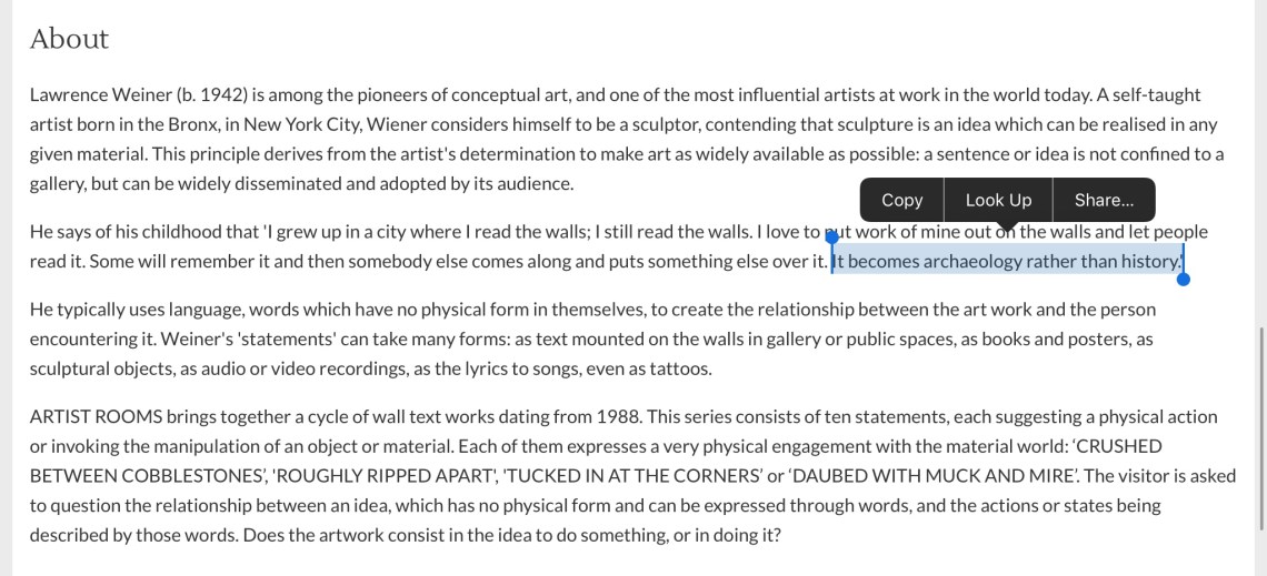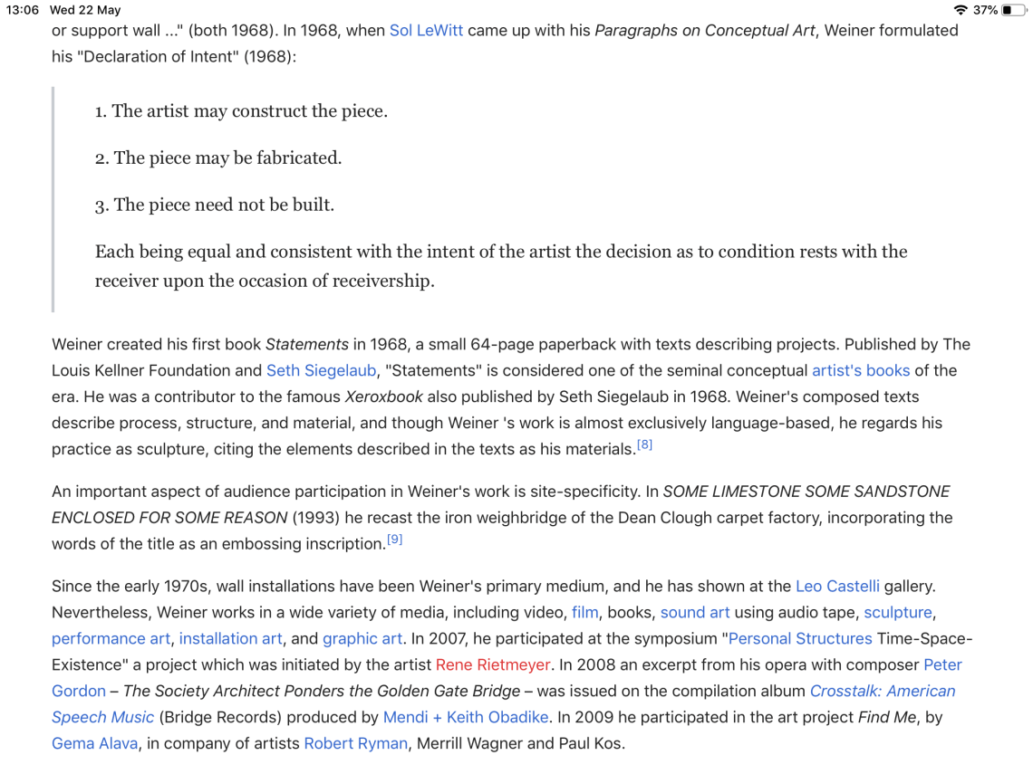 Lawrence Weiner LukeH96May 22, 2019Brookes, FMP, Research and influences - art student Post navigation PreviousNext Powers of composition.. Note to self: look up this Statements and Xeroxbook stuff Share this: Click to share on X (Opens in new window) X Click to share on Facebook (Opens in new window) Facebook Like Loading... Related