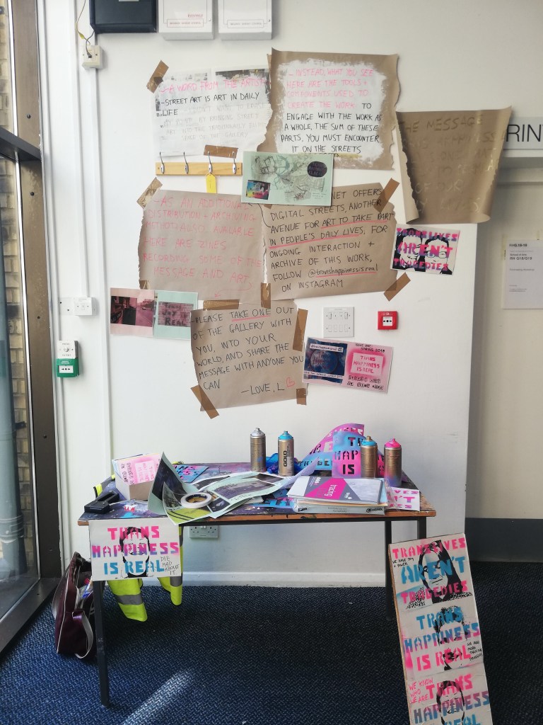 Summary: make more zines, get boxes, try stickers, get A3 paper, test wall statement, ask Louise about double sided tape, bring newsreel from home, try posters in window/outside