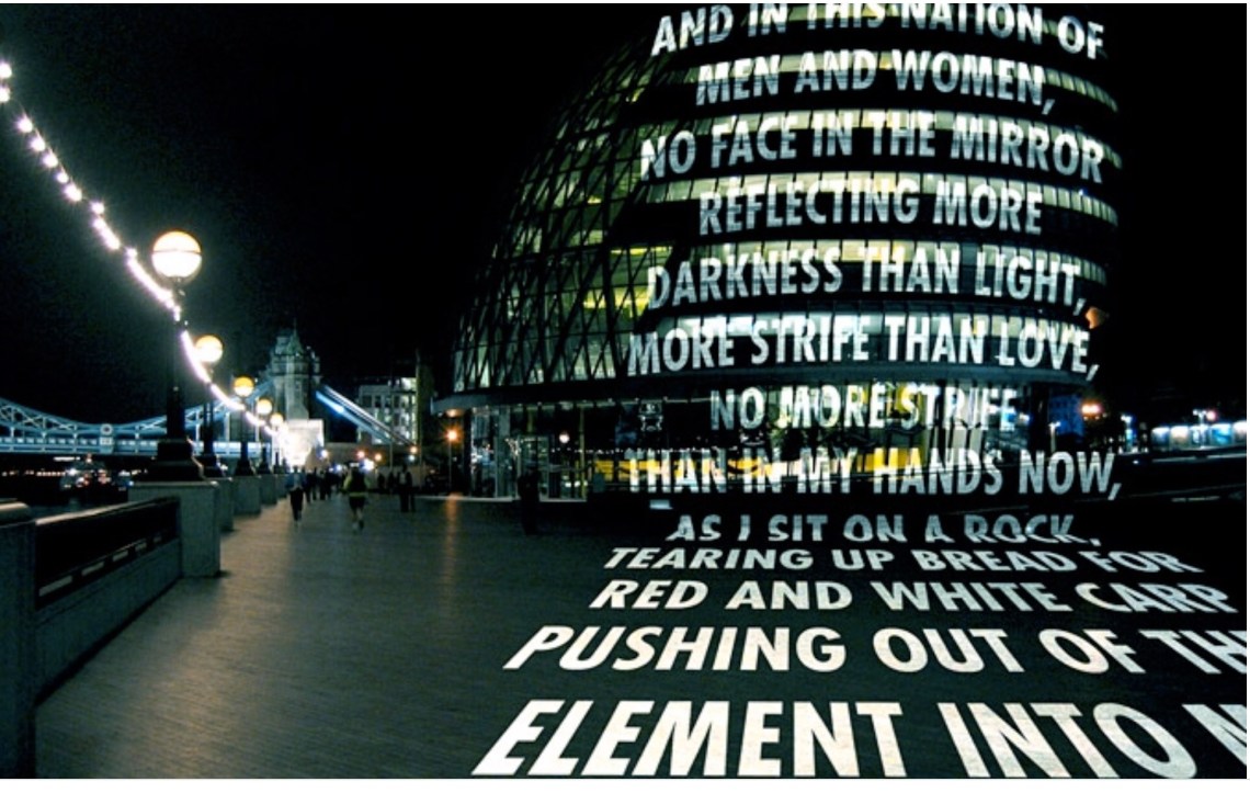 Projection: street art that isn’t sure enough of itself to try a semblance of permanence? It’s dramatic, but something in it also feels cowardly. Is it because it’s easier?: to get building-high words, it’s much easier to project them than to try to paint the whole building (is it? I’ve never tried, to be fair)