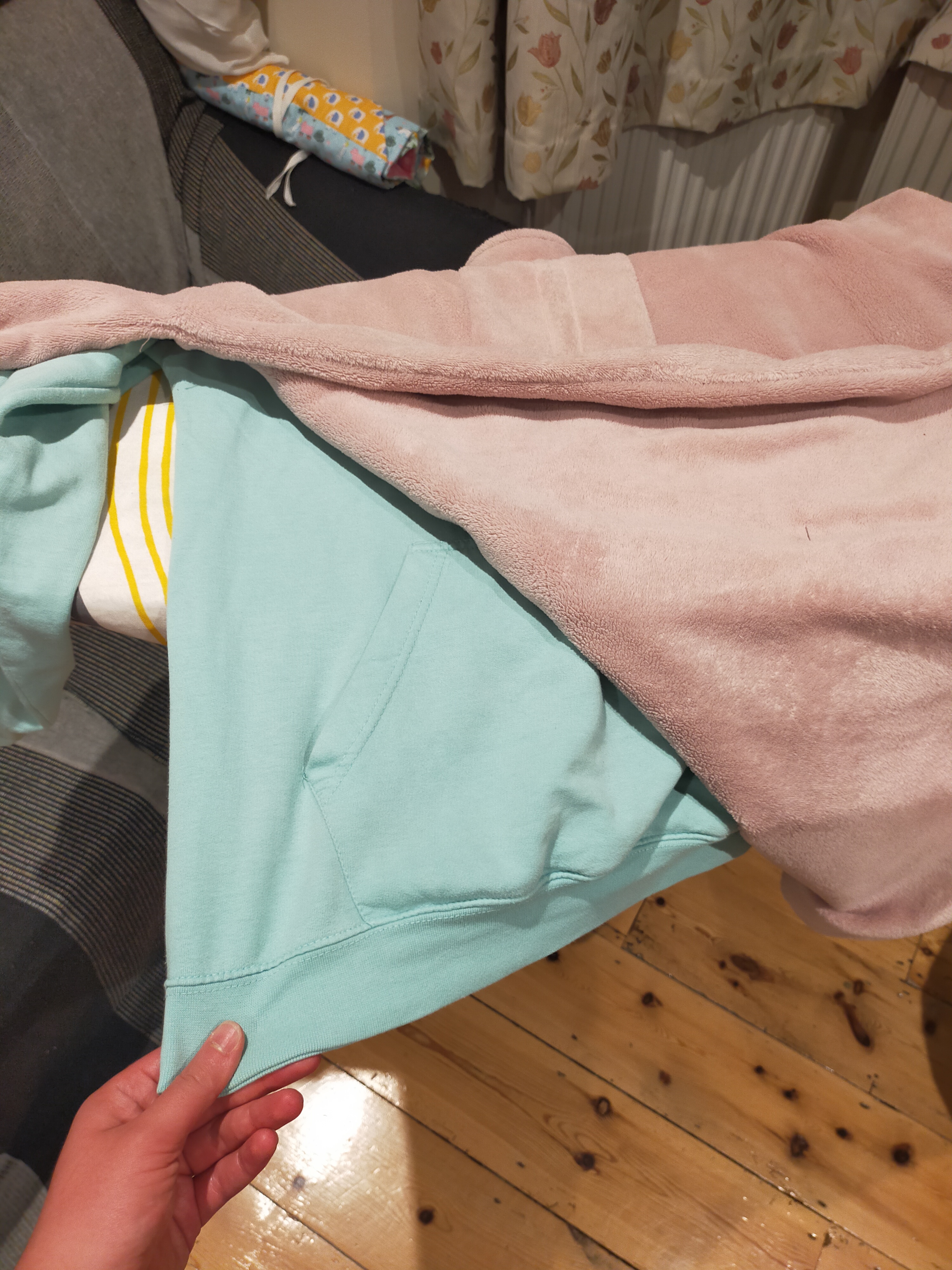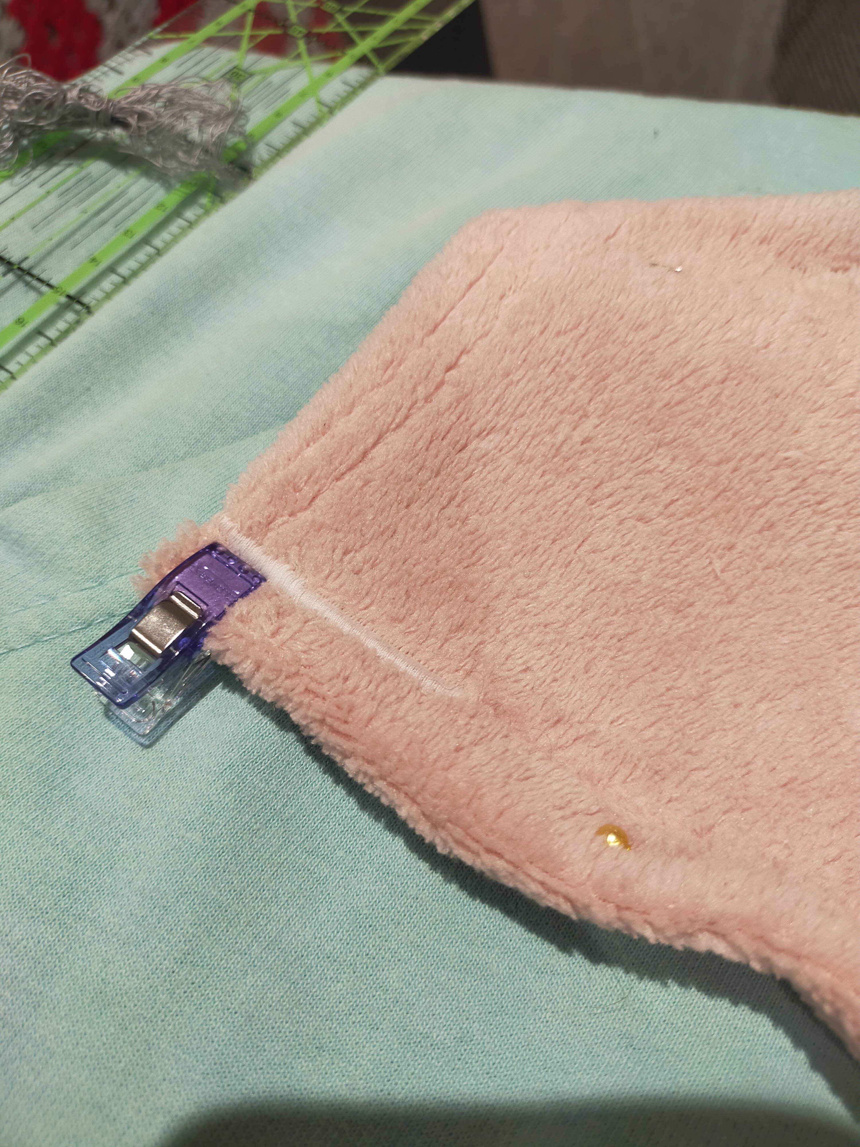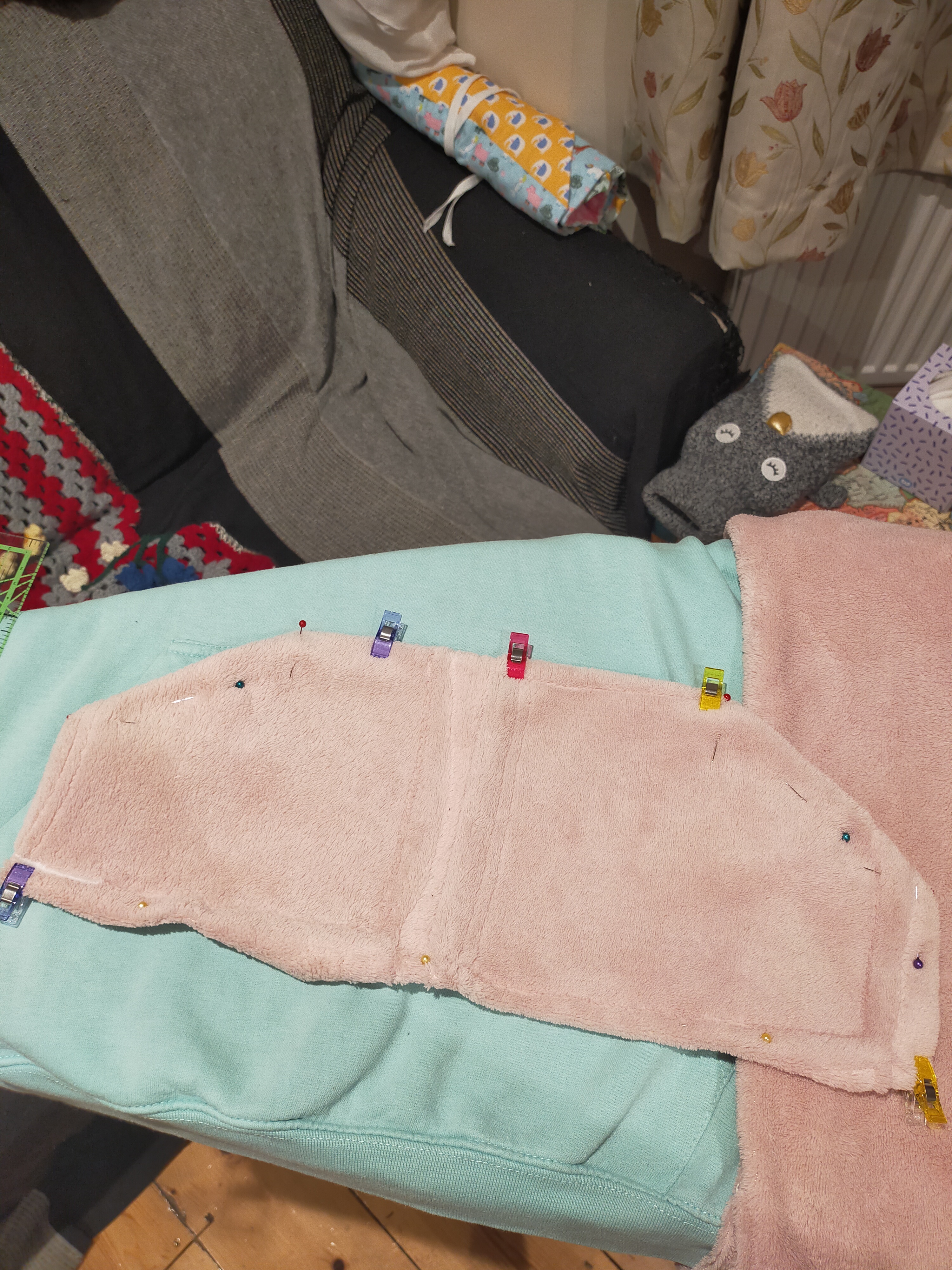 Used a beloved RTW hoodie to figure out how high the pocket should sit – my pink pocket is not as tall as the turquoise RTW one, I marked the top and bottom of the turquoise on the pink tunic with a pin and pitched the pink pocket in between those two pins.