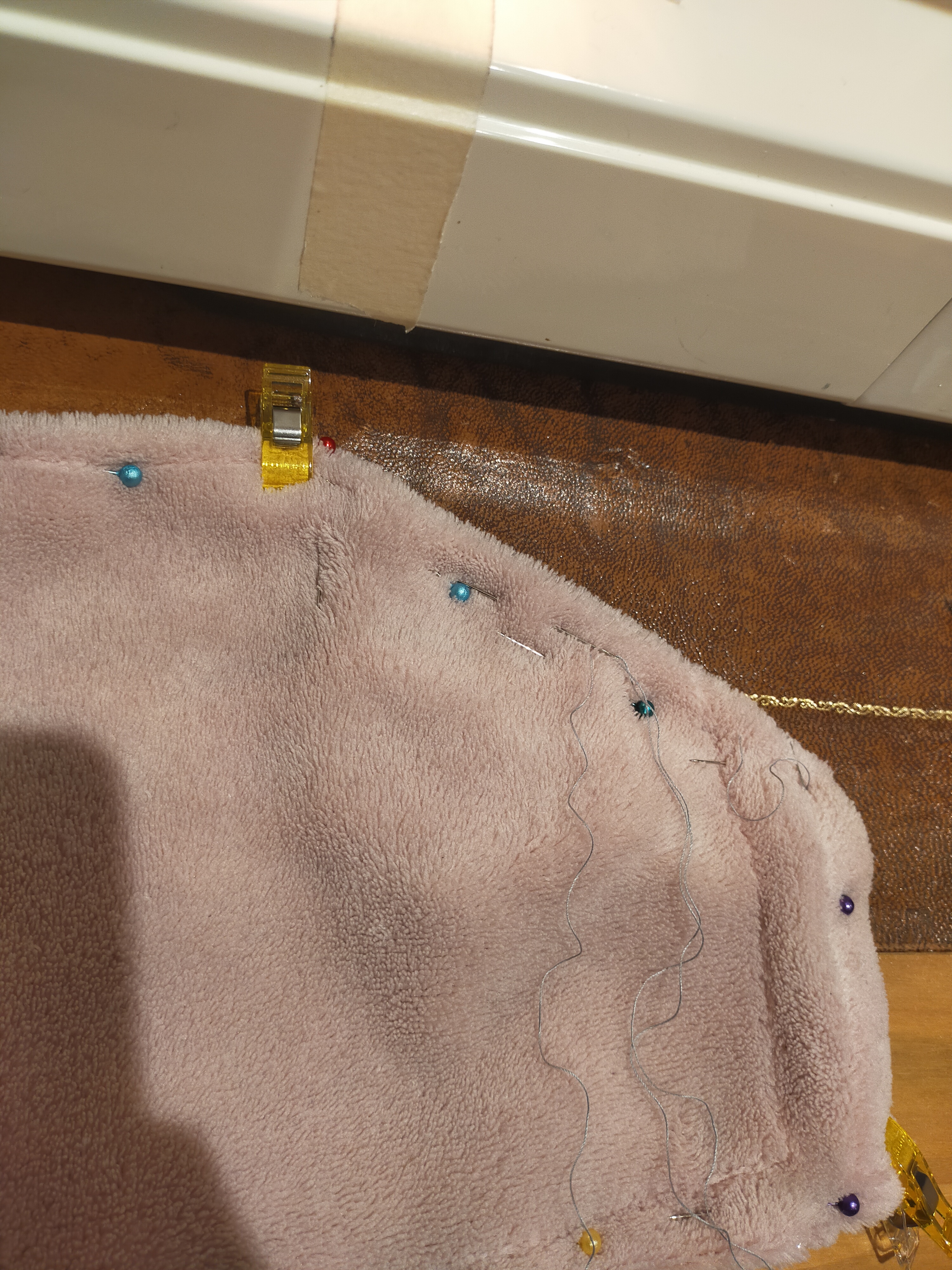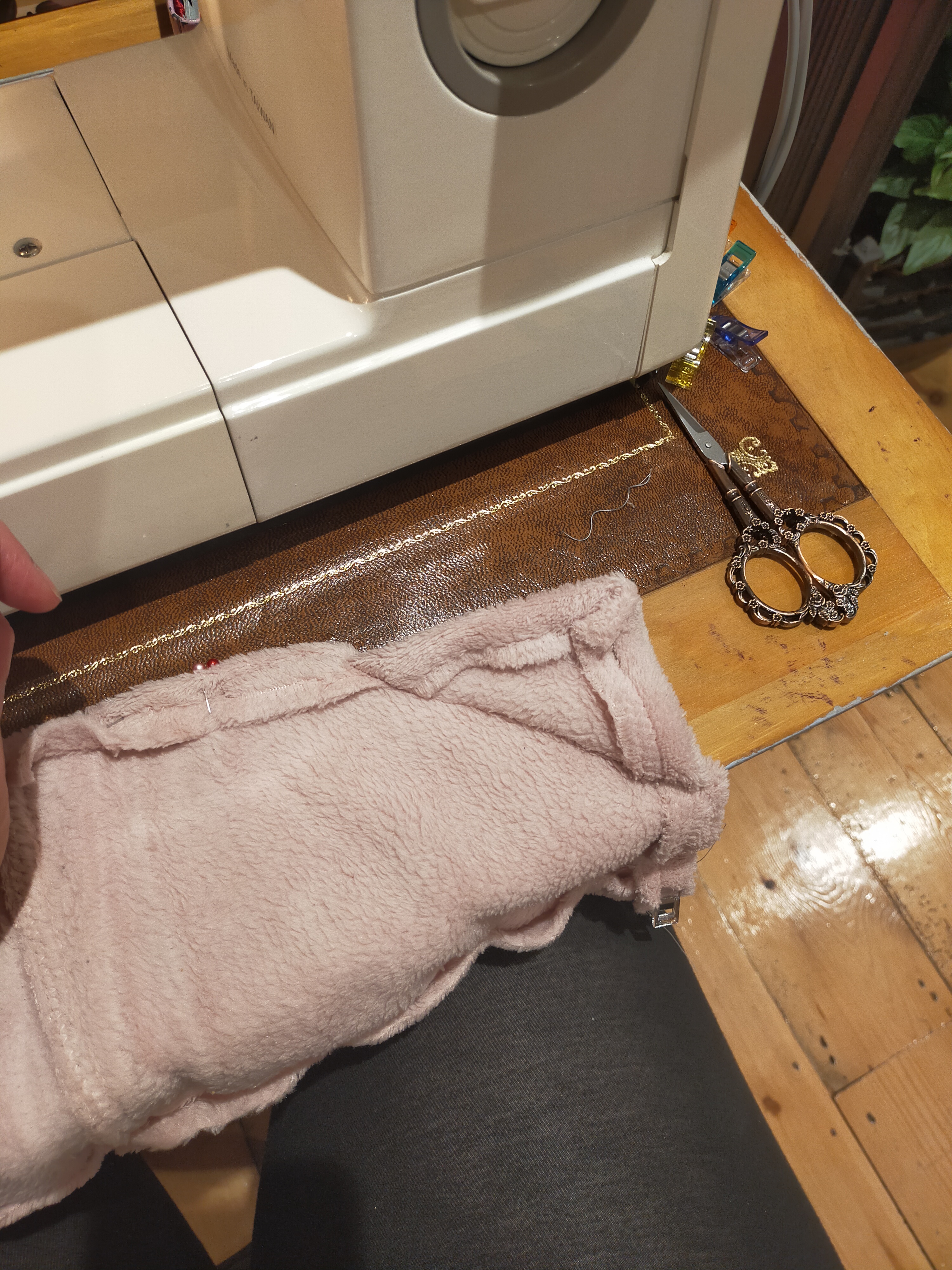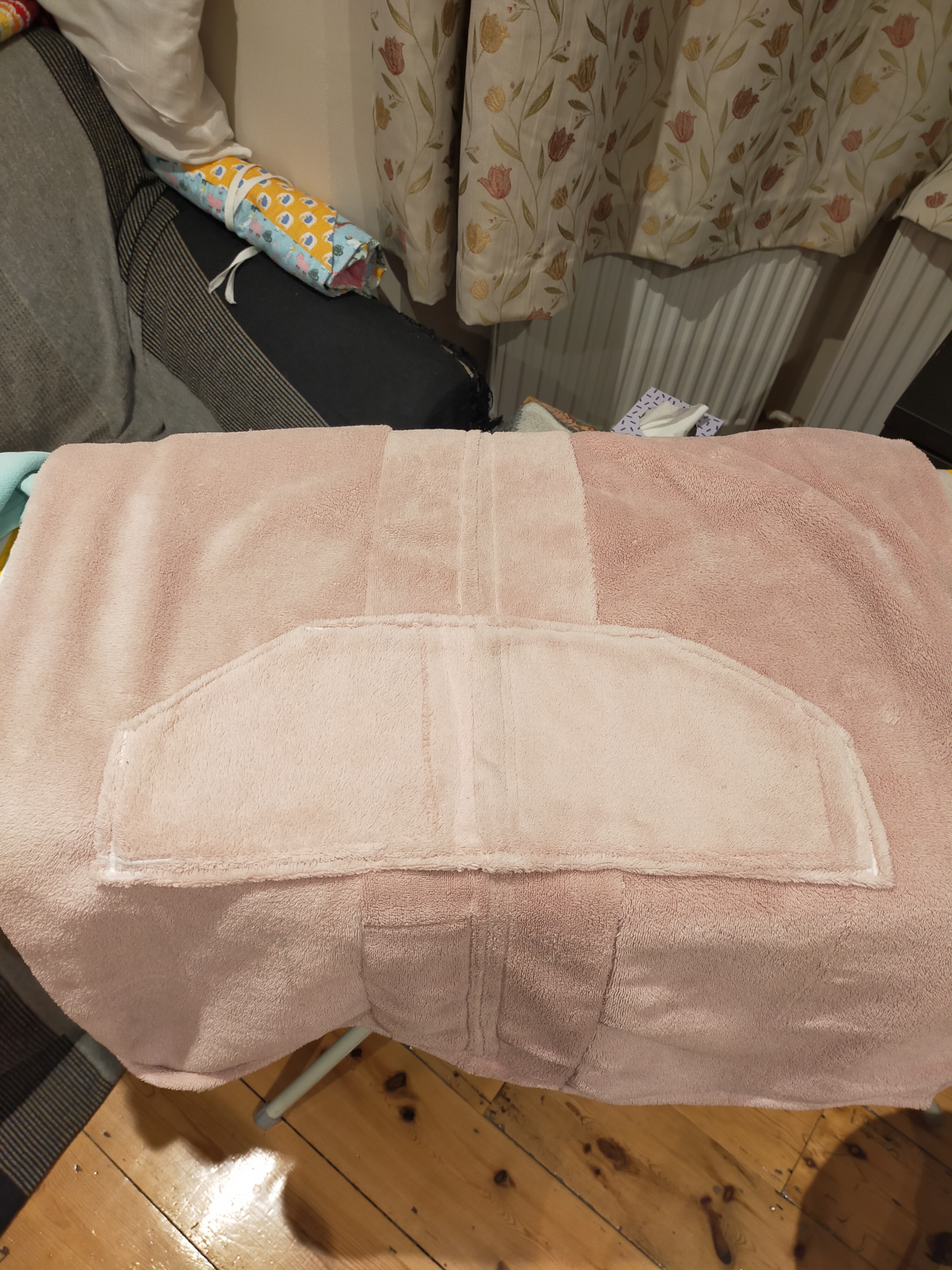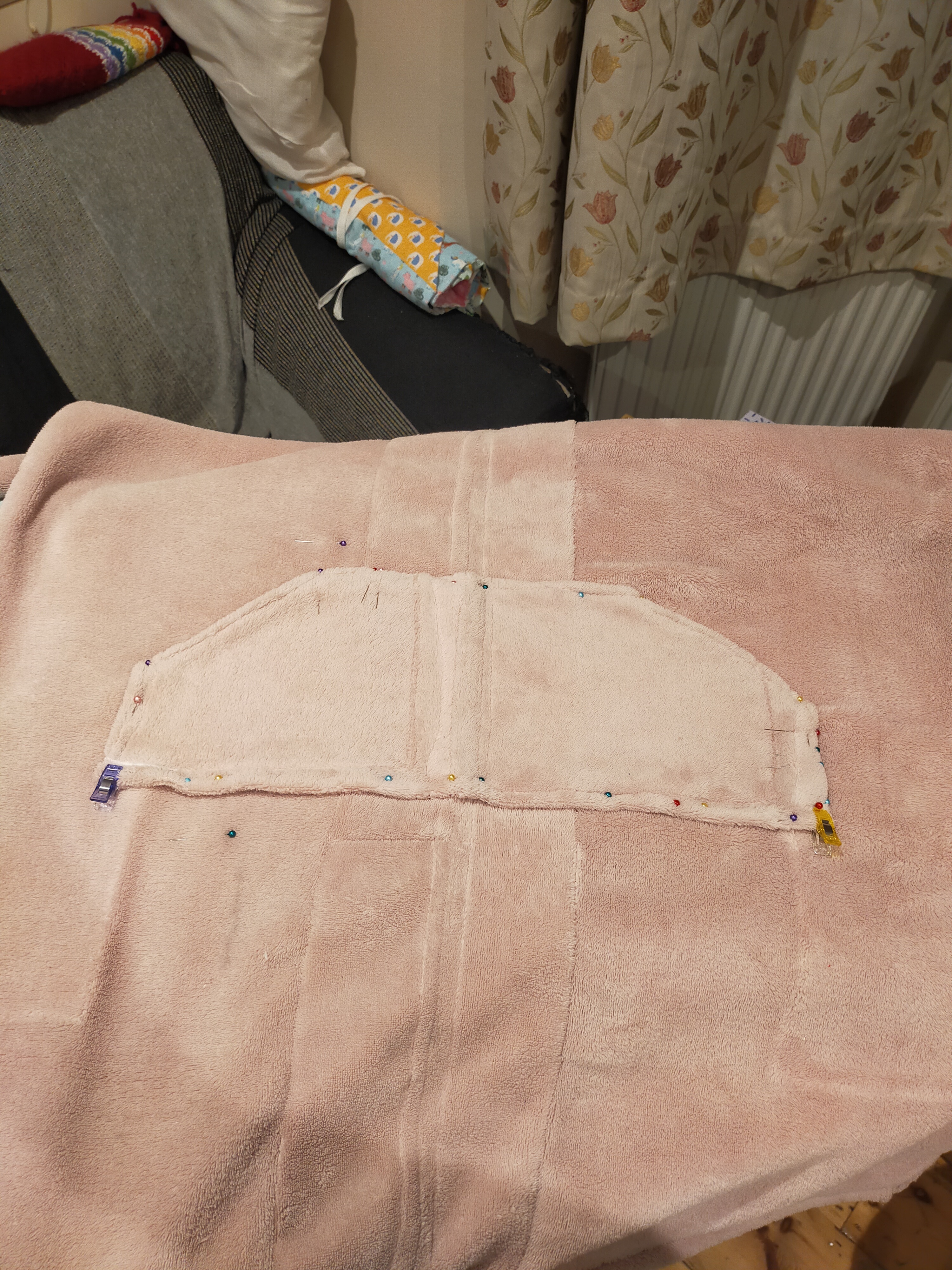 Pinned all the edges under and tried to make it as straight edged as possible. Then measured 4″ in each side at the top, 3″ down at each side, and folded under the connecting triangles. Didn’t want to press this squishy fleece, so pinned the hell out of it. Pinned it to the main garment to check the openings were big enough to get my hand in. Took it off the main garment again, hand basted the folded triangles down, then sewed the folded triangles down the make the diagonal openings – started and finished my sewing about an inch round the corner to secure the folded seam allowance down.
