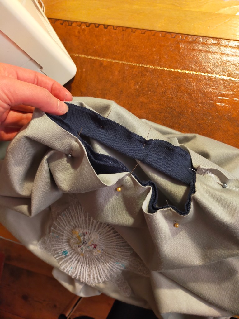 I’ll admit that it’s occurring to me now that maybe I should’ve stay-stitched the neckline before hauling the front around doing all that embroidery? Does one stay-stitch knit necklines? Either way, I’ll be gently gathering it into the neck ribbing, so it shouldn’t matter. Making a mental note to pay attention how much gets gathered into the front vs back.