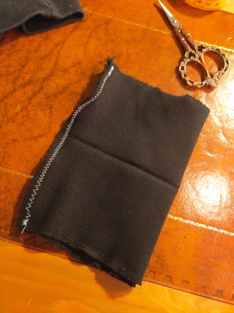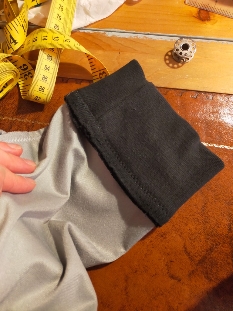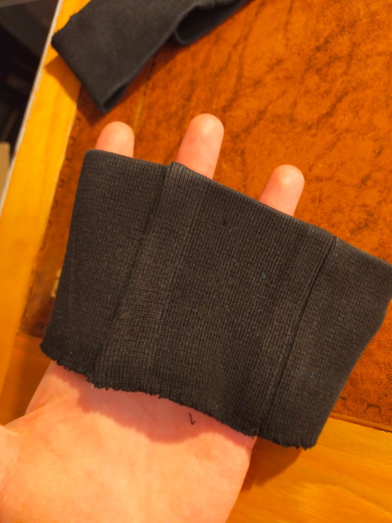 Wrist cuffs – for these I am using upcycled cuffs actually from the ankles of a pair of RTW trousers, which wore right through at the inner thighs (twice), but the rest of the garment is totally fine. I did narrow them a bit, although not a huge amount as I nearly always wear my sleeves pushed up my arms. I probably should have opened up the original seam/sewn with a straight stitch so I could press the seam open, but at this point 11:30pm on a schoolnight, I just wanted it done, so I didn’t – forgive me. I did at least sew the new seam with the cuff folded open, so it’s hidden inside when folded in half and attached to the sleeves. And I did manage to get two cuffs the same width!