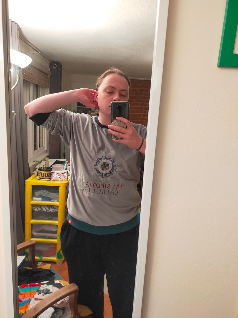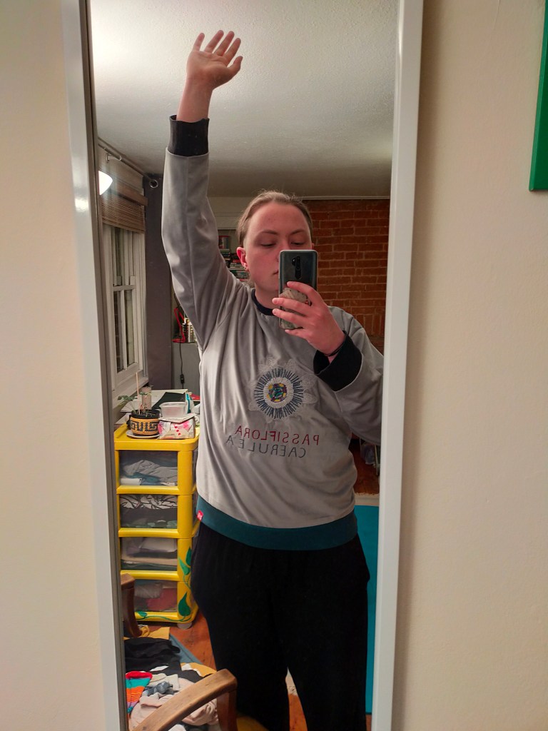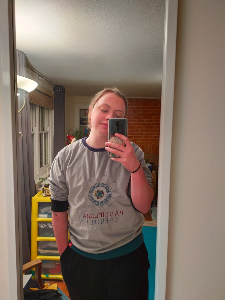 - Neckline ribbing really needs to be wider (as well as longer?), and I’d like the crew neck to be slightly narrower. My newby imprecise SA and cutting skills possibly affected this somehow? (can’t quite wrap my head round if I added half an inch to the neck line on the front and back pieces, whether it would make the neck hole smaller or larger. My gut says smaller but I confused myself looking at tips for fitting crotch curves earlier)
