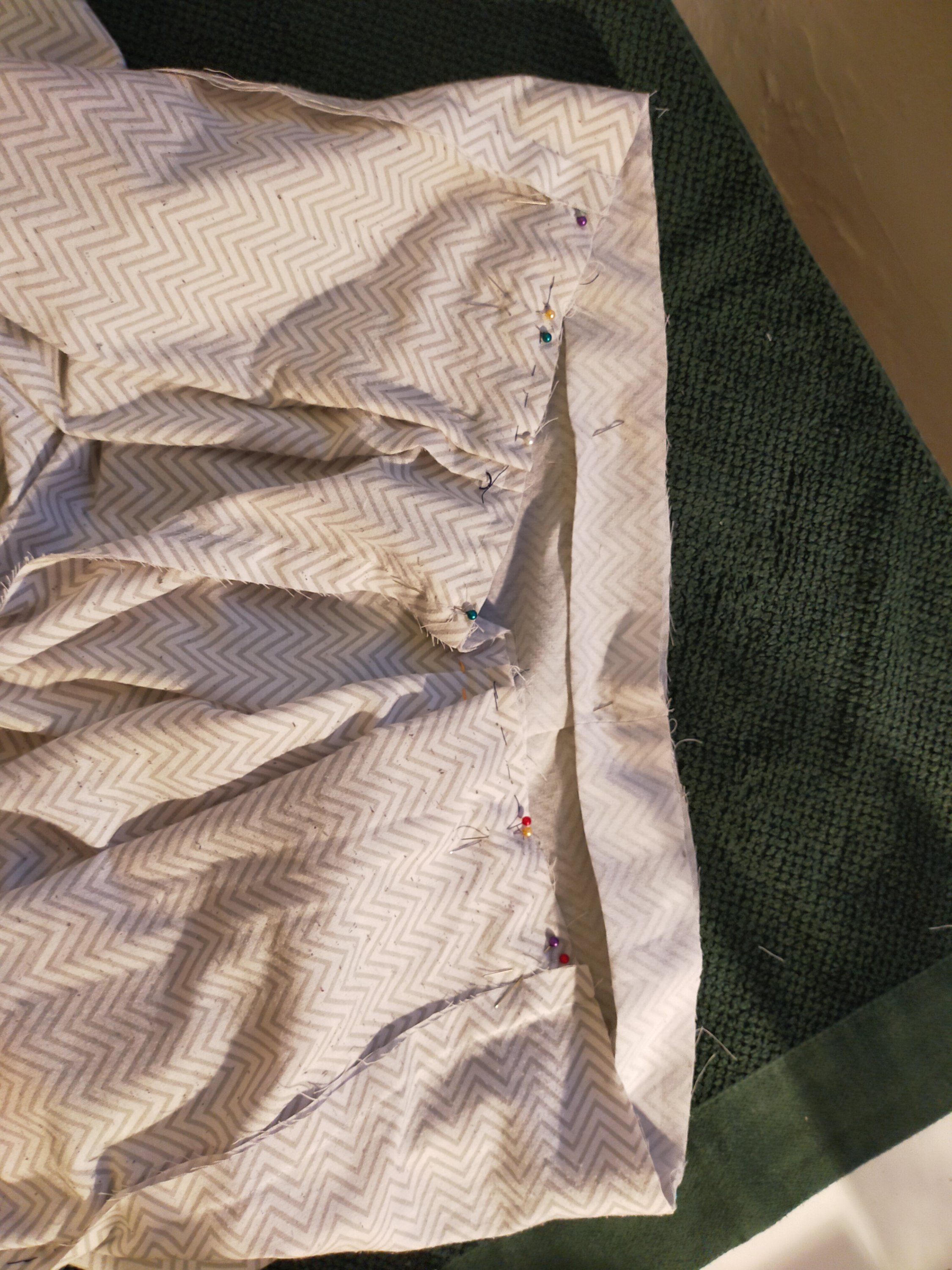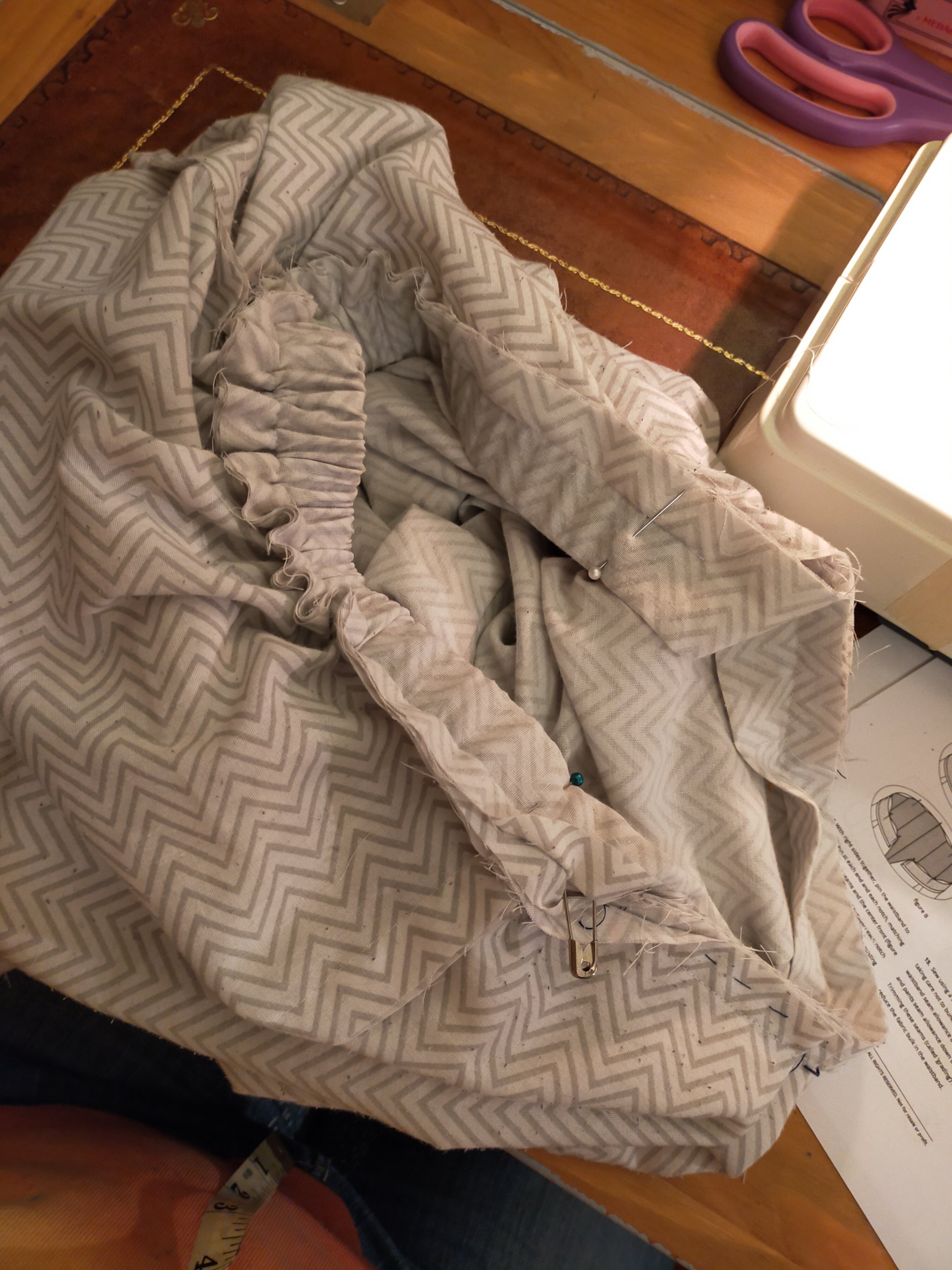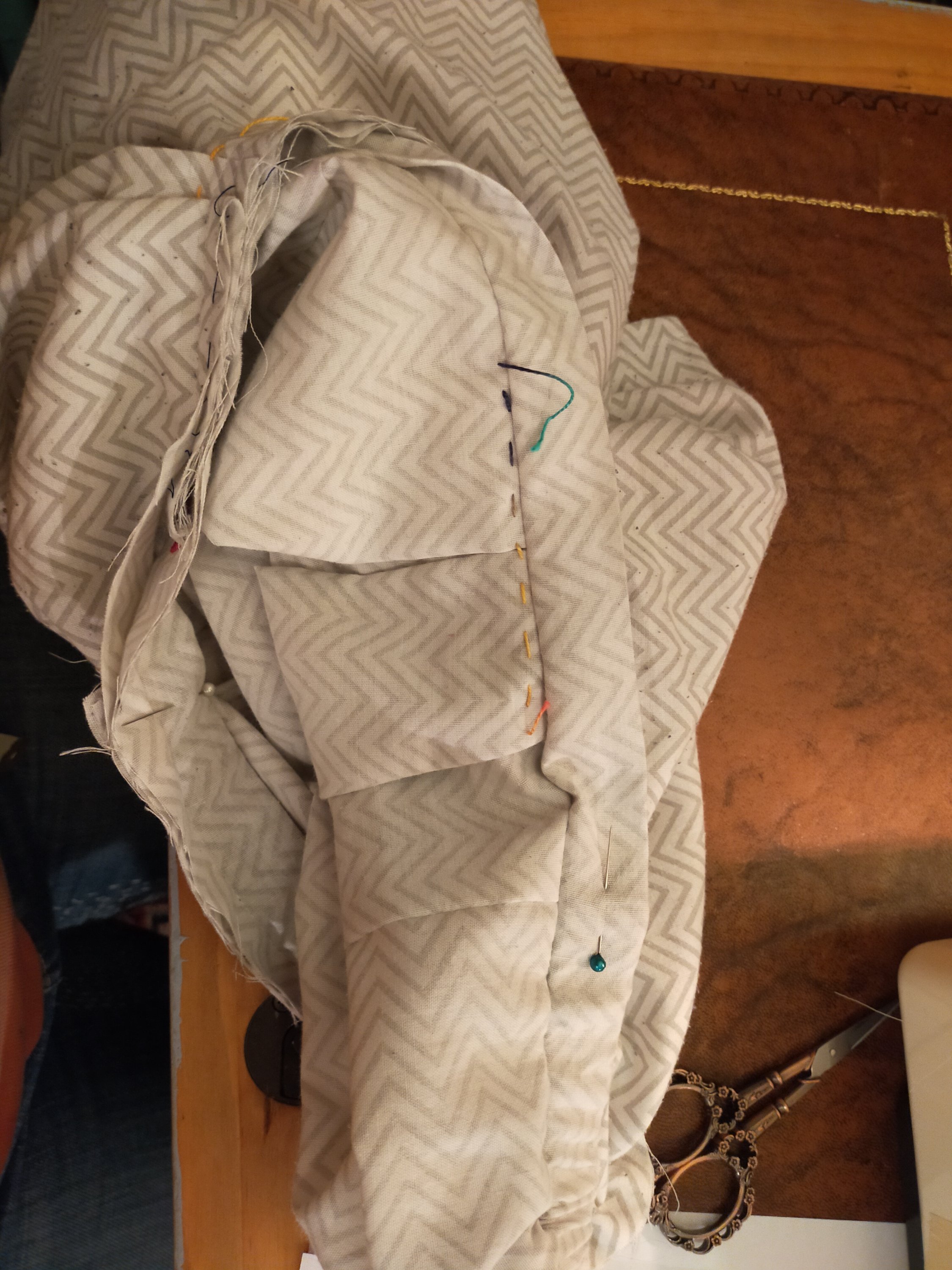 The basting holding the right pocket to the pleat and front came a little loose at the end, so the pocket and pleat are about a 1/4″ lower in the SA than the front, and the pocket droops a tiny bit. Good to note and avoid, and the parts I basted with pearl cotton didn’t work loose in the same way.