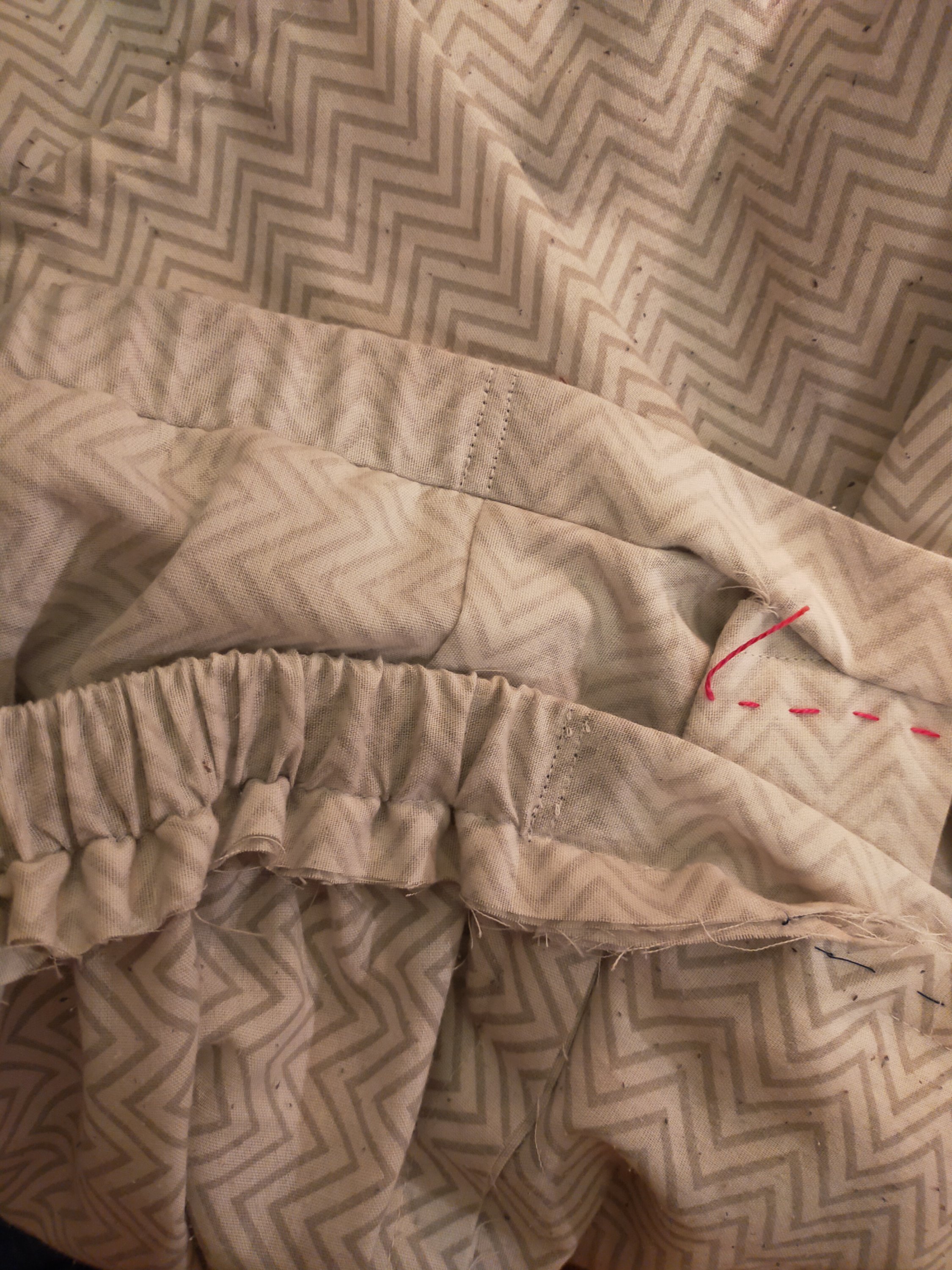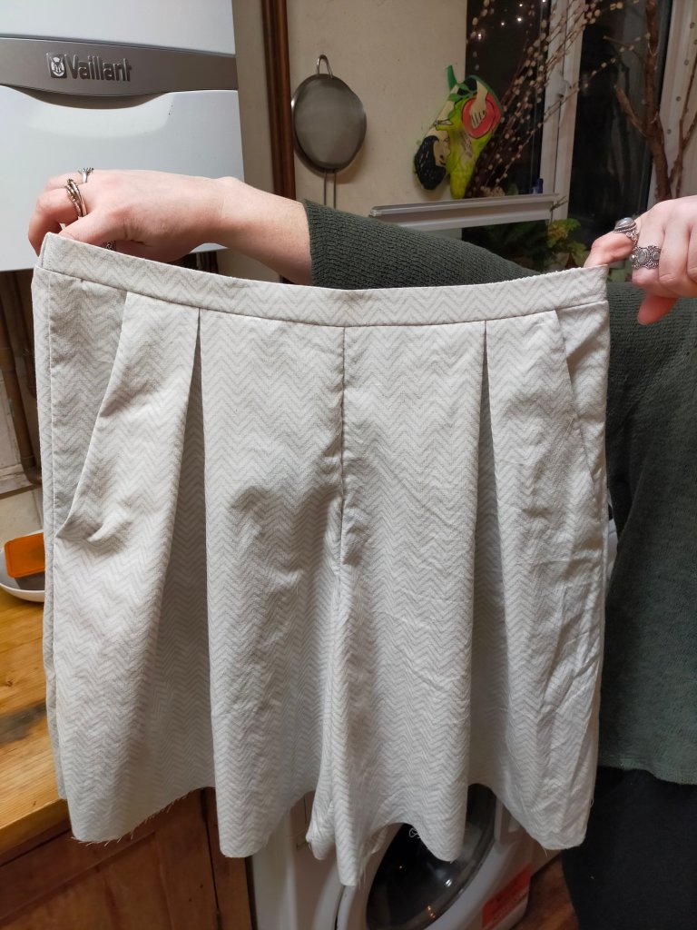 Did a bunch of chaotic waistband maths (when I have a maths breakdown, I have to do it in writing). Cut waistband, sewed short ends together, pressed seam open, folded and pressed in half. Sewed waistband to culottes leaving two gaps. Pressed SA up, changed my mind, pressed it down again. Cut elastic, inserted elastic, lost the end, found it again, sewed elastic down at side seams. Closed the two gaps, didn’t bother finishing the seam the side seams as it’s a muslin, took out the basting stitches. (I gotta say, I may not be able to sew in a reliable straight line yet, but I’m pretty pleased I sewed to measurements well enough I didn’t cross that 1/8″ gap and catch my basting stitches in my sewing!)