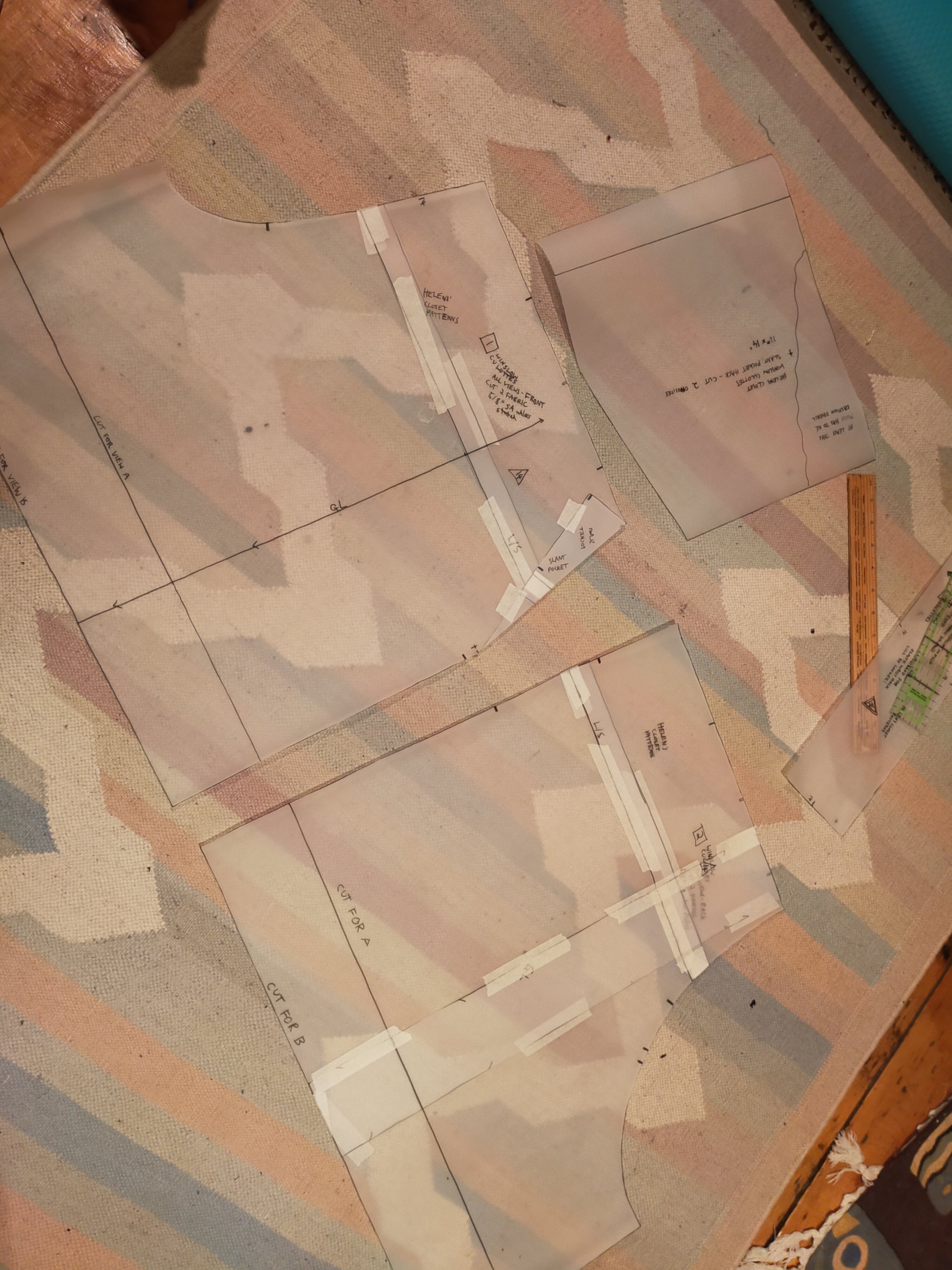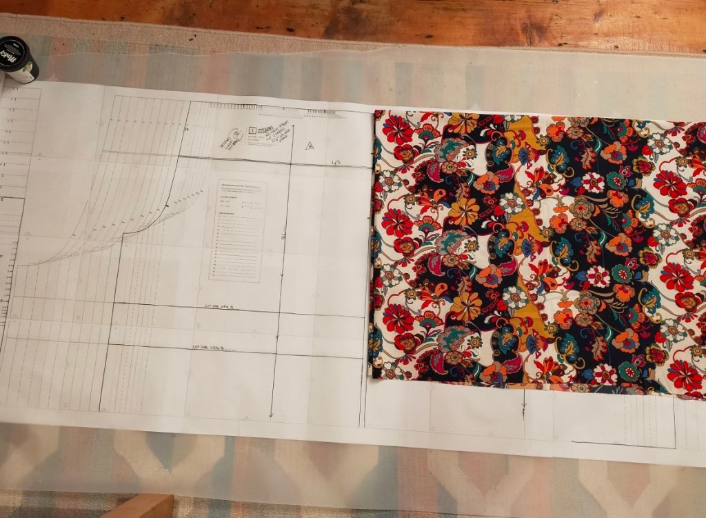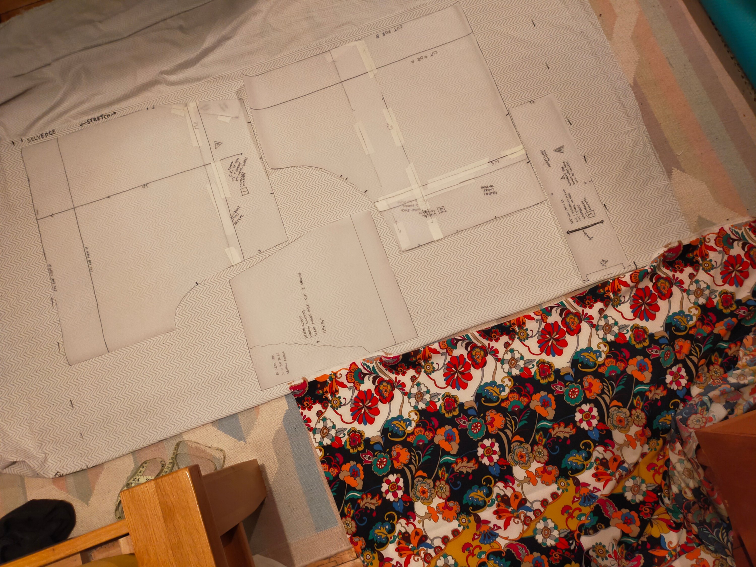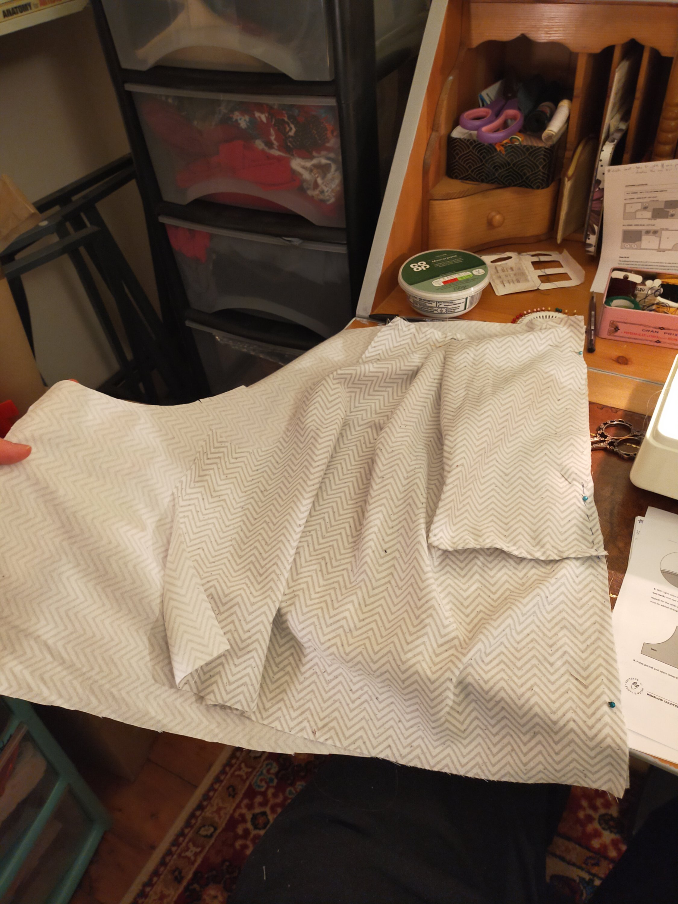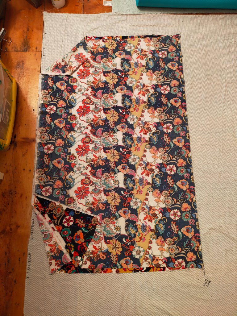 Tested layout on the muslin. I thought I’d been all clever and managed to get all the layout to fit, but it was 10pm on a Friday, the straight pattern piece edges are confusing me, and I now notice I’ve got the fronts on grain and the backs on the cross-grain. Doesn’t matter for the (nonstretch woven) muslin, but for the (2 way stretch, printed) fashion fabric I’ll need to rethink the layout and check carefully. I wonder if I just flip the back pattern piece on the diagonal if that would do it?