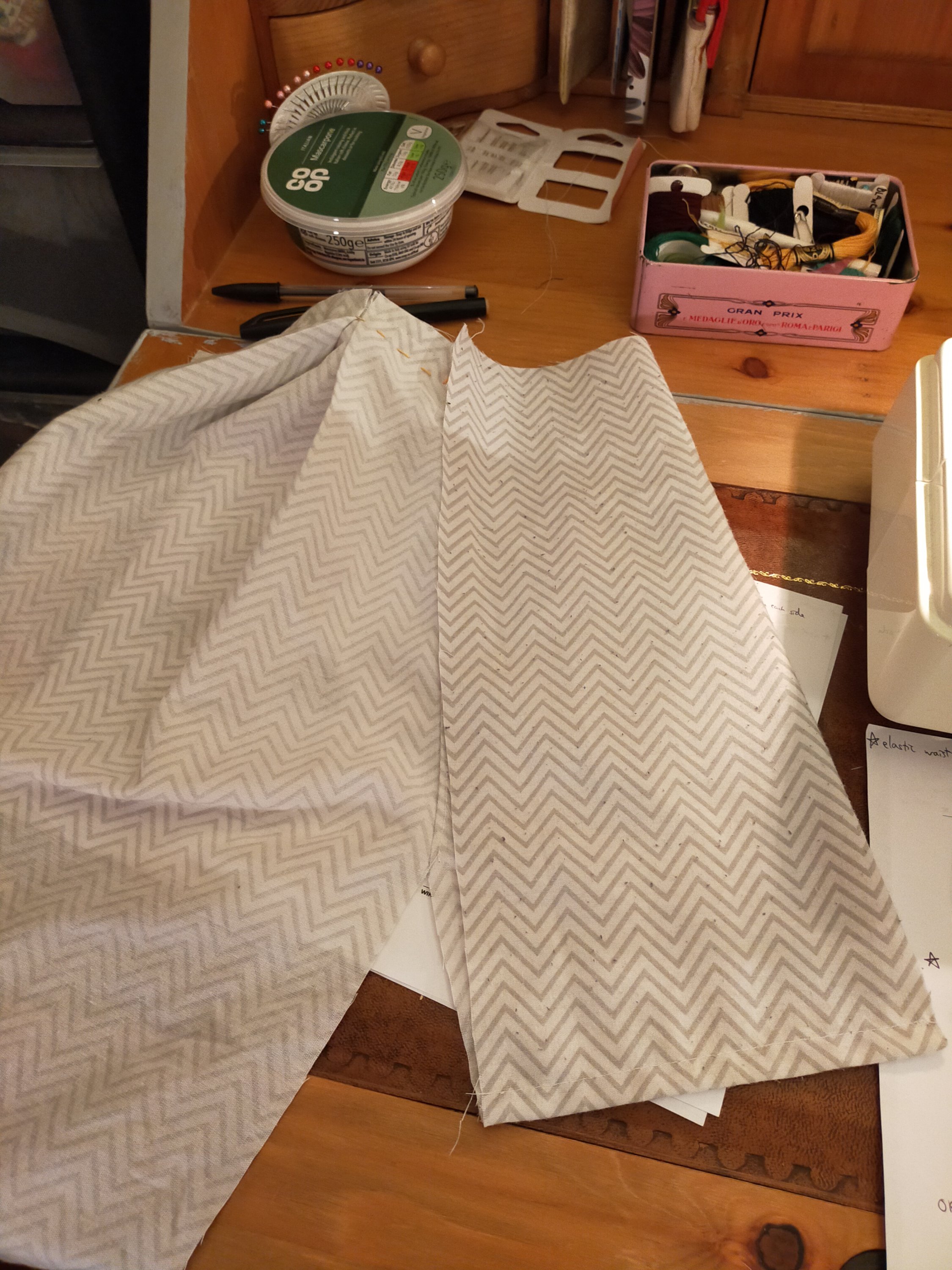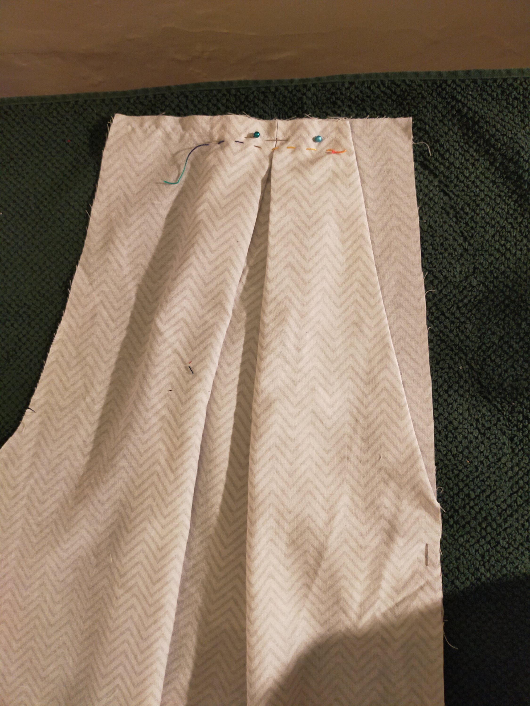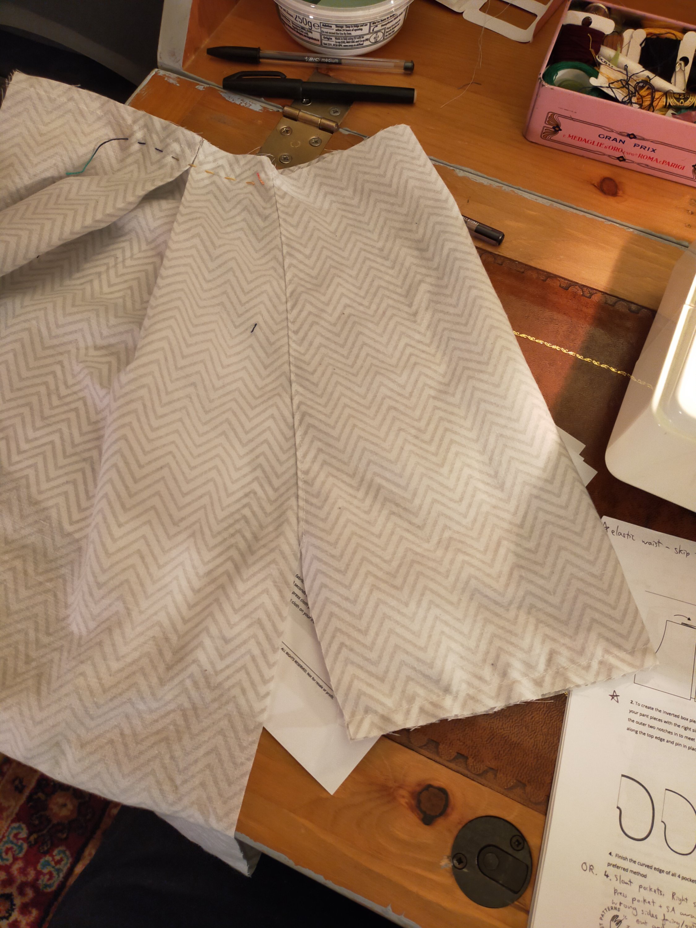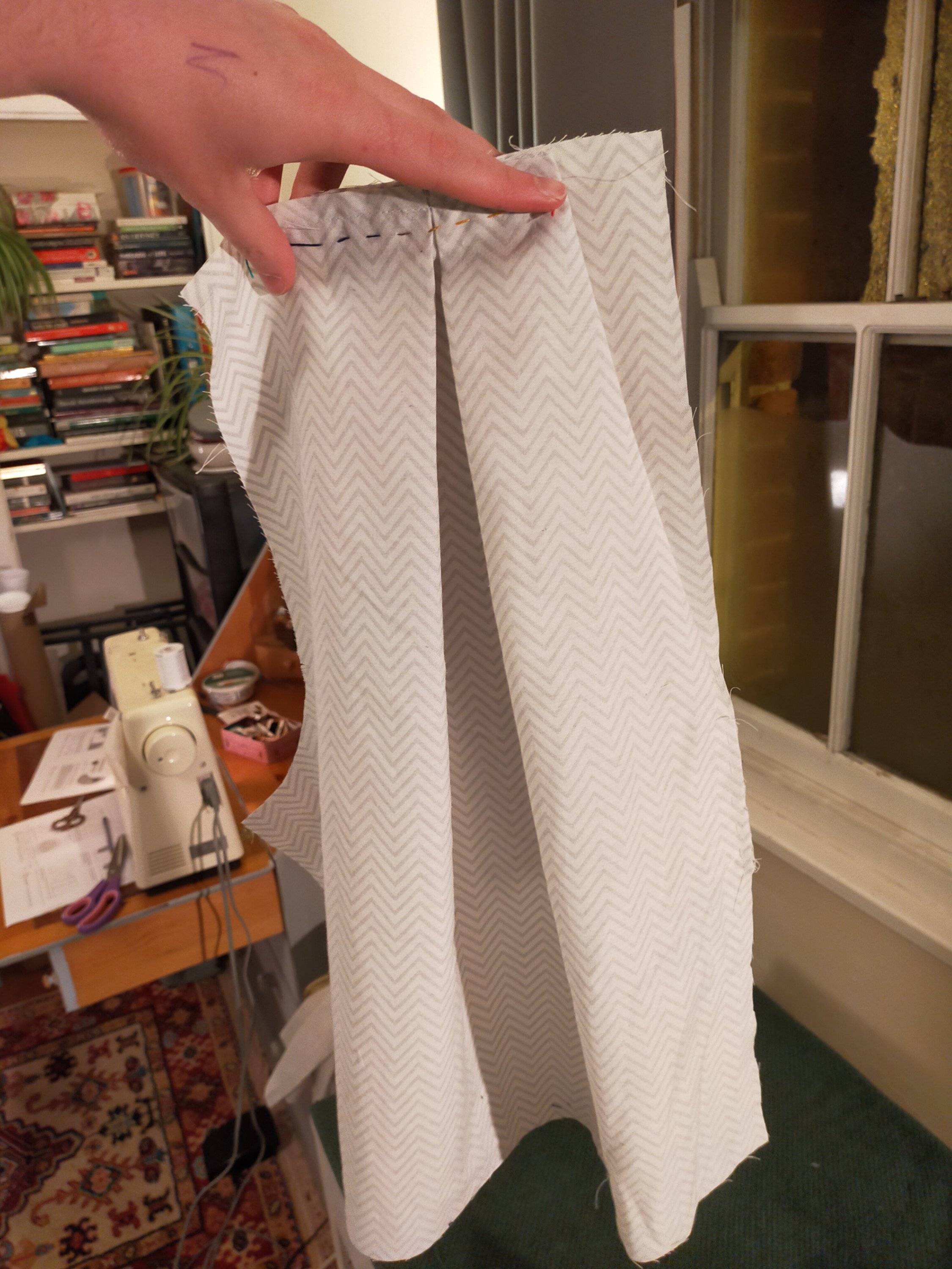 Pressed, stay stitched, basted the pleats. Sewed and basted the pockets in. Sewed the side seams. Sewed the inseams. Realised I’d gotten carried away listening to Ra Ra Rasputin and forgot I’m using the wrong side of the muslin as the right side, and sewn the inseam on the right side. Got the seam ripper out, felt a bit proud I hadn’t needed it yet, ripped out and resewed the inseam. Sewed the crotch curve.