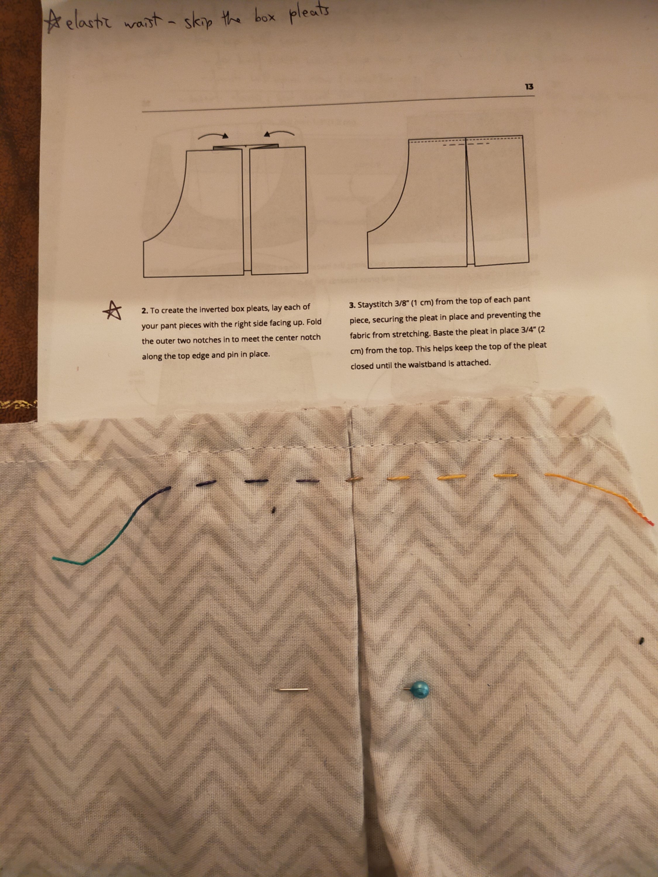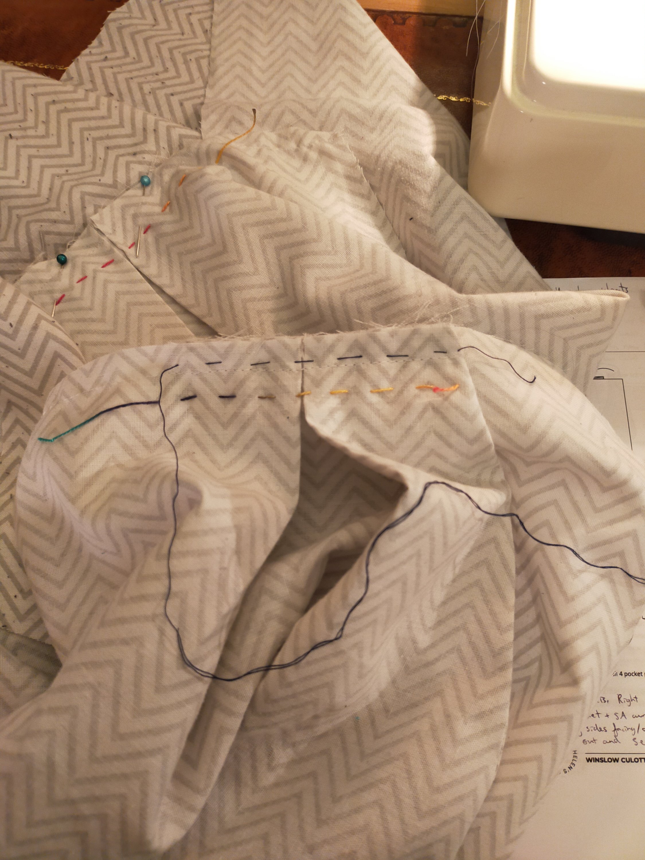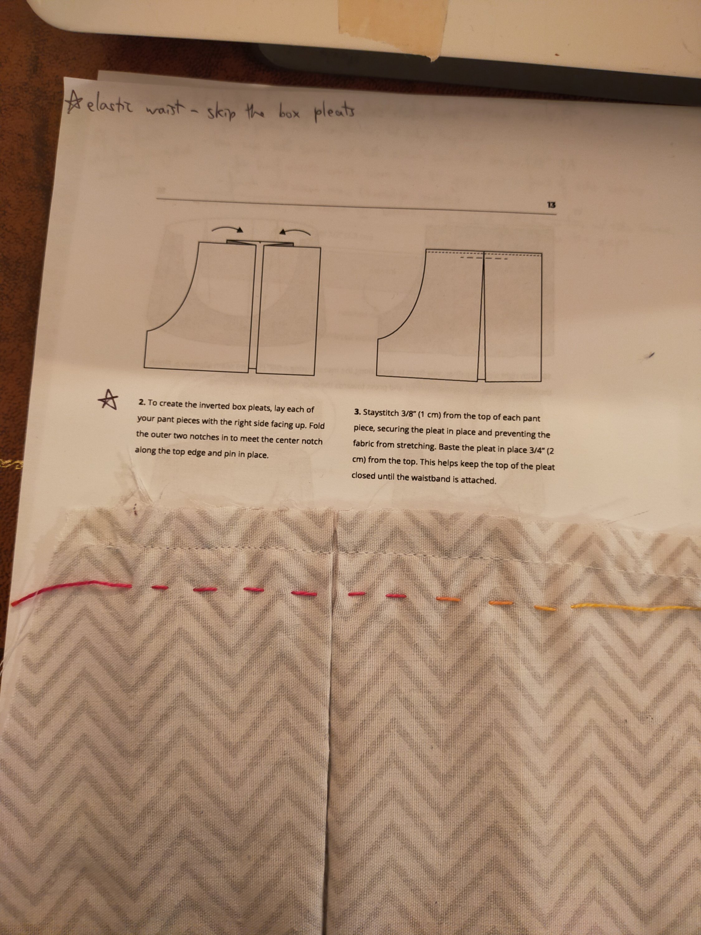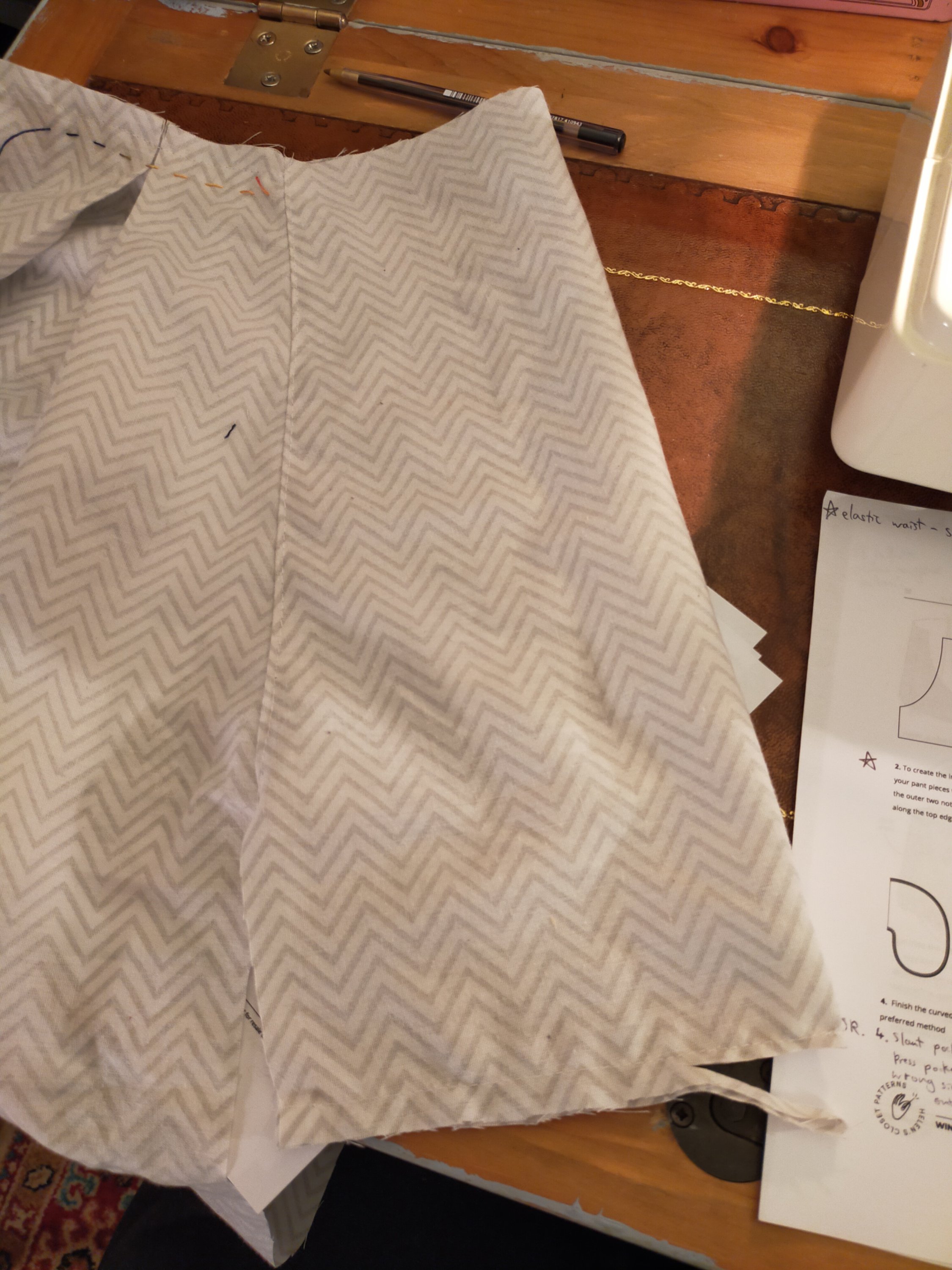 Pressed, stay stitched, basted the pleats. Sewed and basted the pockets in. Sewed the side seams. Sewed the inseams. Realised I’d gotten carried away listening to Ra Ra Rasputin and forgot I’m using the wrong side of the muslin as the right side, and sewn the inseam on the right side. Got the seam ripper out, felt a bit proud I hadn’t needed it yet, ripped out and resewed the inseam. Sewed the crotch curve.