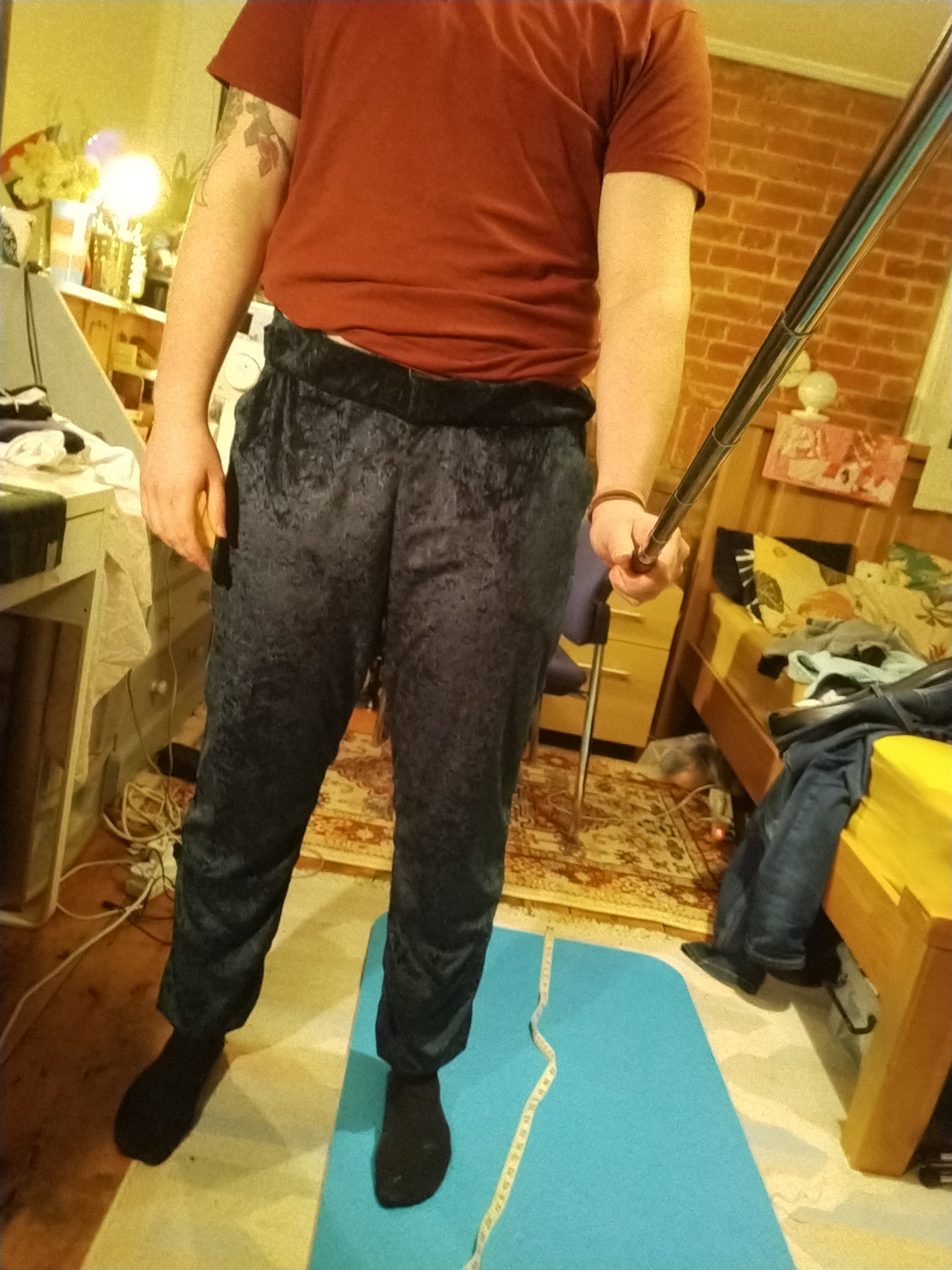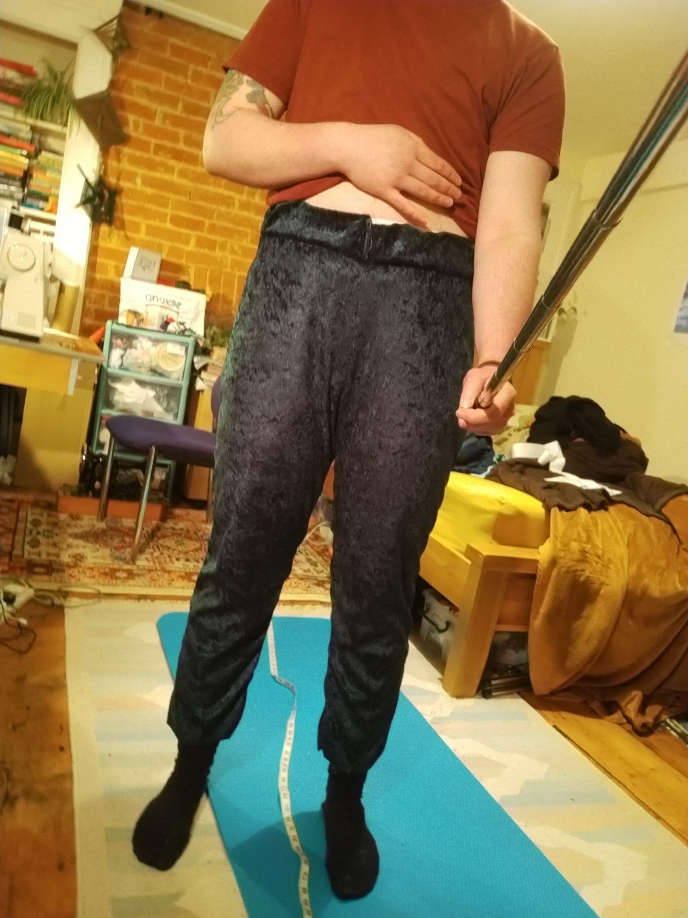 Things to sleep on: do I want to take the waistband off again to remove 2″ from the front waist and see how that sits (that would increase the waist circumference, where taking a wedge out doesn’t, so no probably not)? Do I want to just neaten my basting line and sew over that to take the wedge out? Should I try laying the wedge on an angle (down from side seam towards crotch?) Increase the wedge to 2″? Take a wedge out of the back rise too (pinching it out suggests it would help), and lengthen the front crotch slightly? If I keep that basted seam line, it’s a weird style line, so does that encourage me to embrace the weird and make them into dungarees? Maybe the size is just too big? I chose it based on the waist measurement and then promptly recut the waist, according to the hips I could’ve gone two sizes smaller, but I really don’t think there’s two sizes spare knocking about at the hips/thighs/seat?