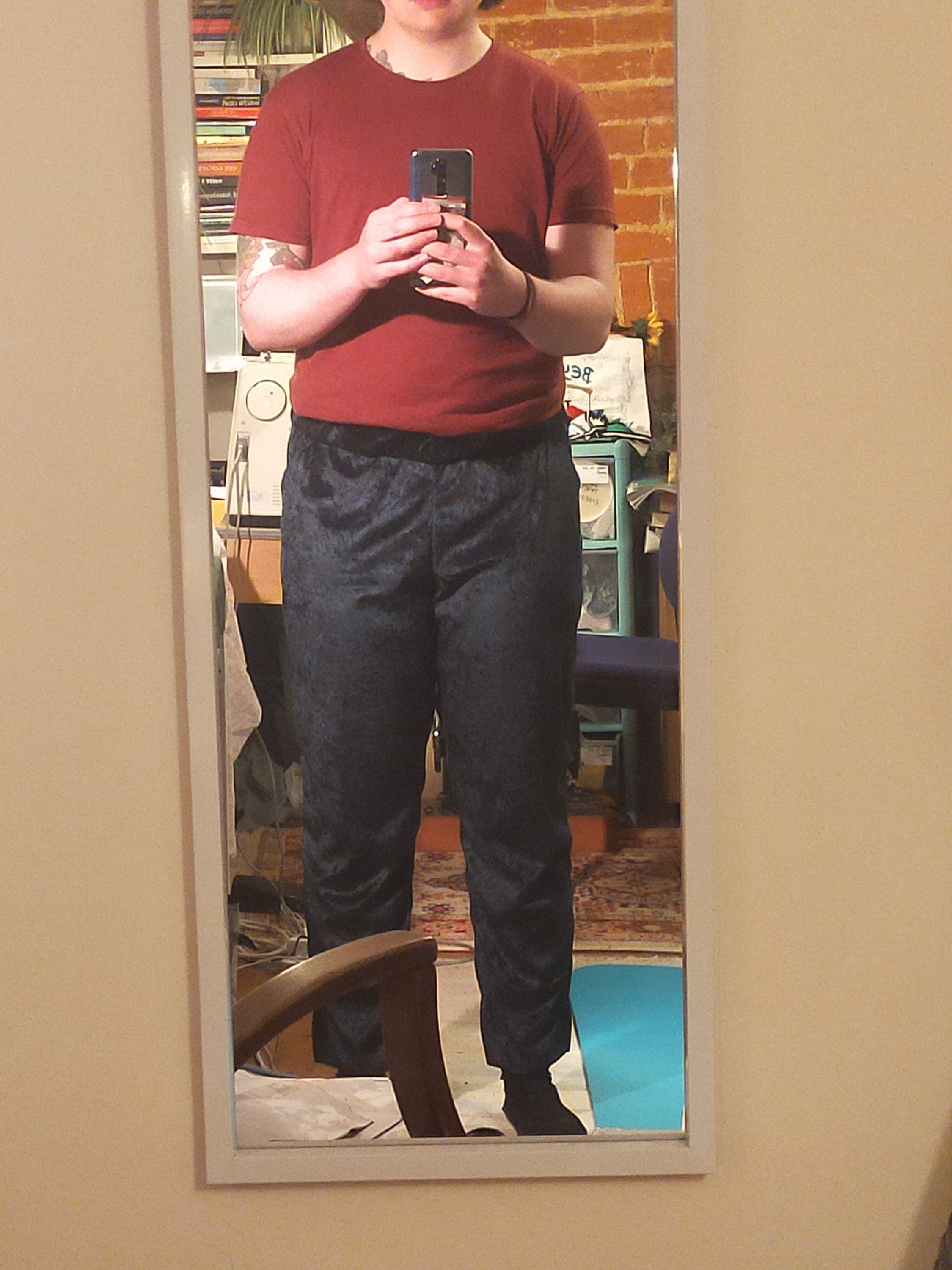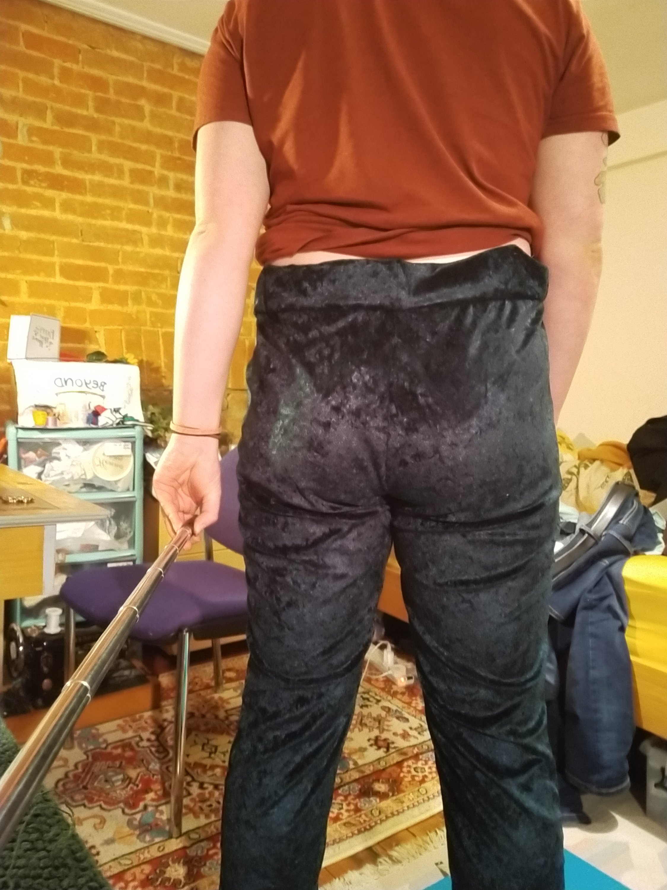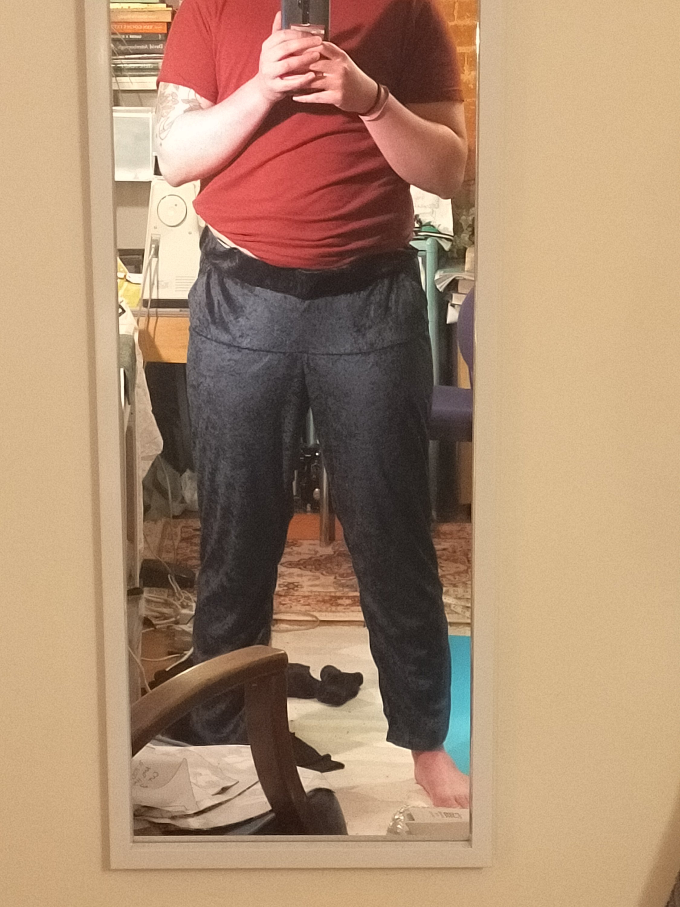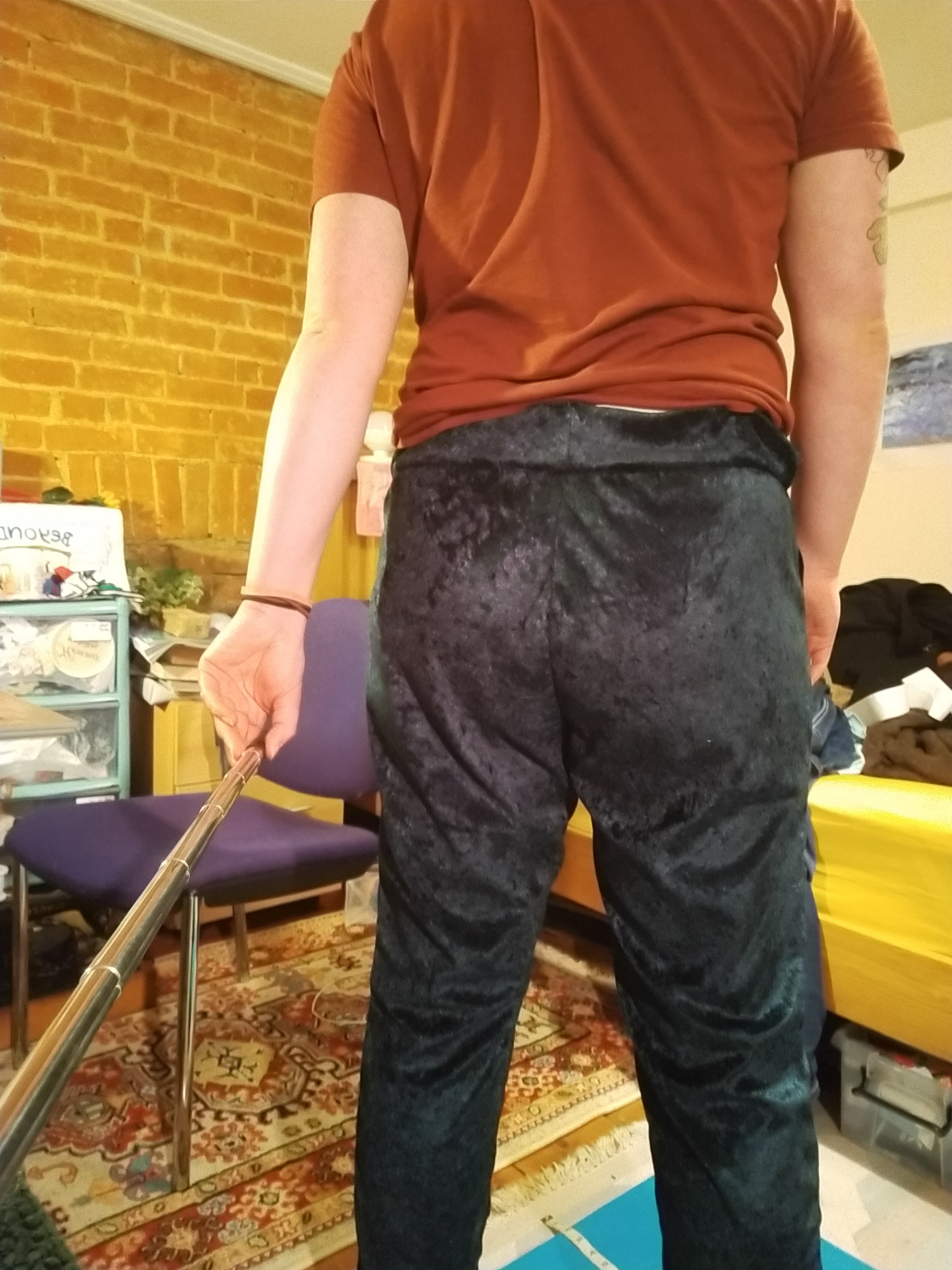 There might still be some vertical lines. They could mean that I need to lengthen the front crotch as well as shorten the front rise (altho it doesn’t feel tight), or that I need to scoop out the front crotch curve (altho it doesn’t dig in), or they could be a product of my basted seam being inaccurate and including some unwanted easing, or they could just be due to the way this fabric falls from its seams. Or something else. Maybe if I addressed those horizontal rear lines and scooped out the rear crotch curve (low seat adjustment), the front lines would release? But I’m overthinking it now, and it’s gone 11pm again, so back on the workdesk they go.