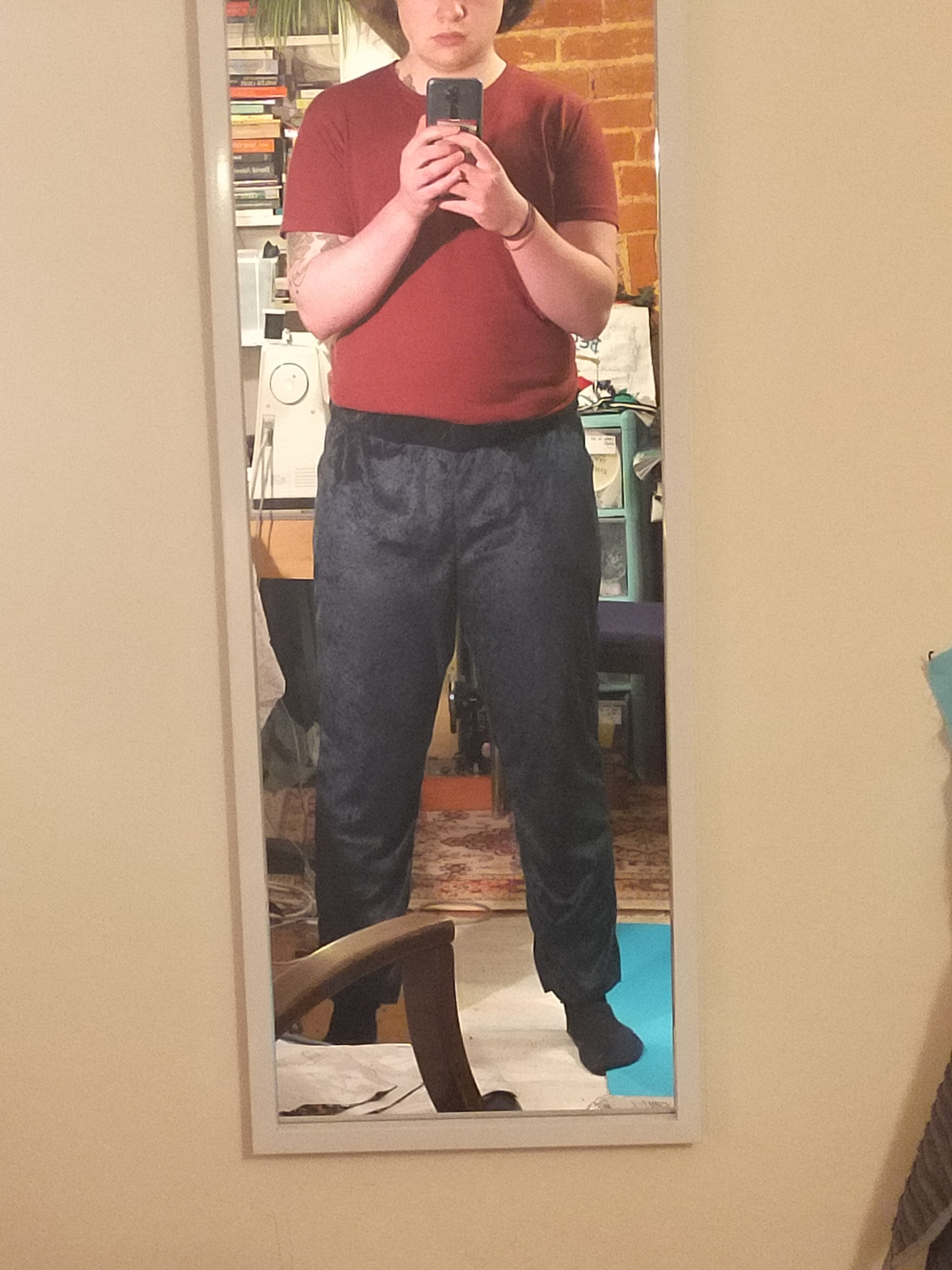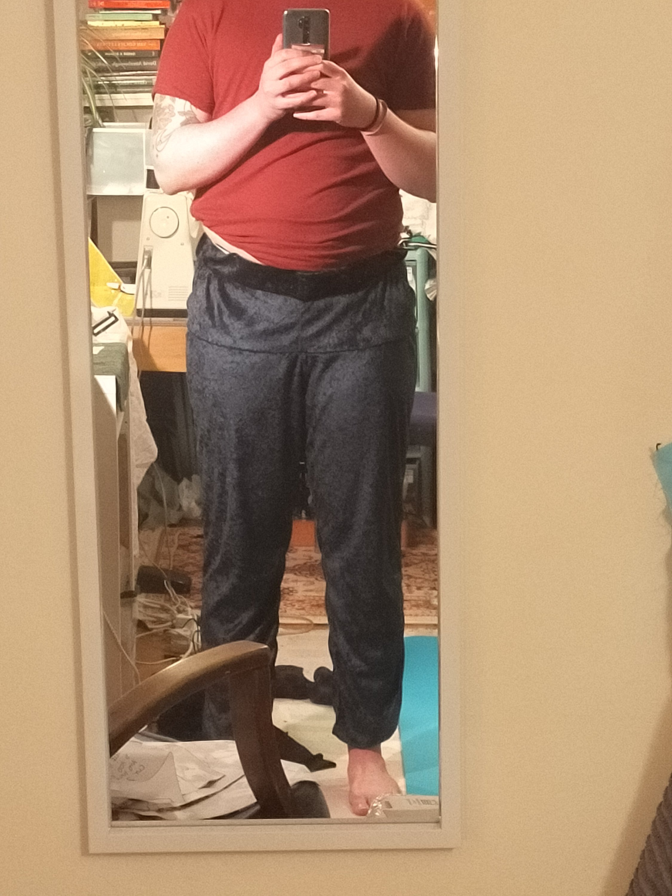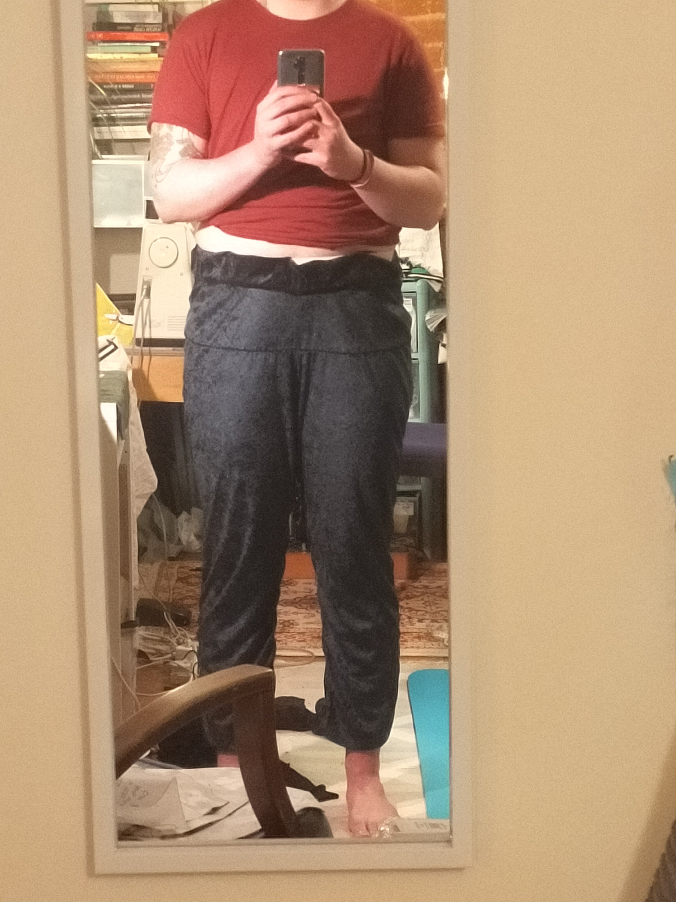 It’s the wrinkles at the front that are really perplexing me. I can’t read if they are smile or frown lines, or drag lines in whatever direction, so I don’t know if they are telling me to lengthen or shorten the crotch, or scoop out or shallow-ify the crotch curve. Going off my best reading of the pictures, they are smile lines, which apparently indicates a need to lengthen the crotch, but should be accompanied by the crotch feeling tight, and it feels the opposite. How do you tell if wrinkles are the ‘too much fabric’ type or the ‘too little fabric’ type? The pants-fitting guides don’t seem to distinguish them. Interestingly, this is the same fit issue I had with the Hayley dungarees and couldn’t pin down (the inseam pockets opening up the waist circumference really didn’t help there), and I also often get this issue in RTW trousers. Do I have less gut than pattern makers expect for my size? Do I just wear my trousers lower than everyone else? Where are you supposed to wear your trousers anyway?? And don’t say waist, cos if that’s the narrowest part of me, it’s up at the base of my ribcage, and I’m certainly not wearing my trousers up there.