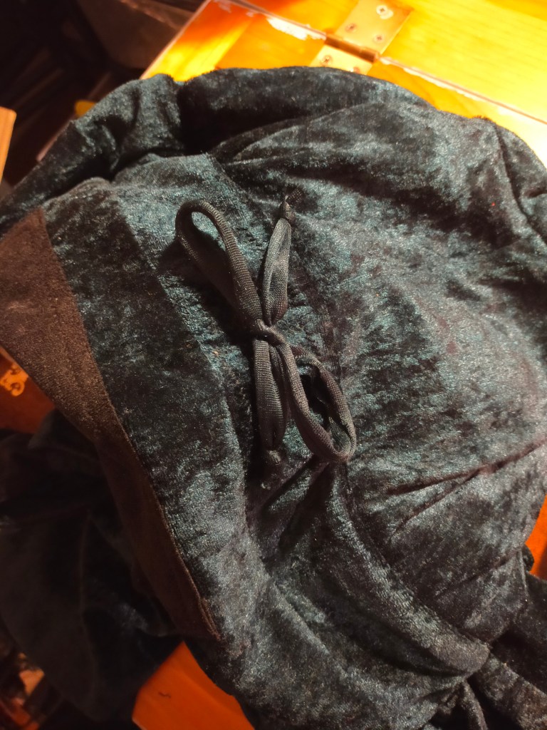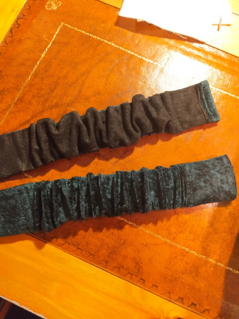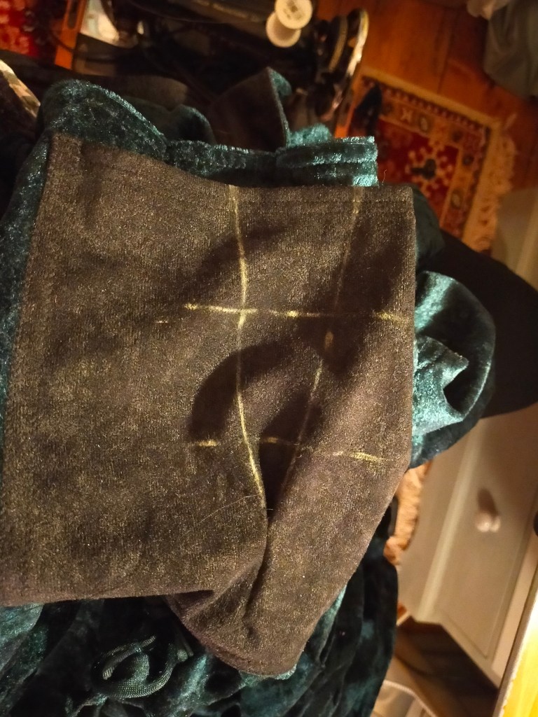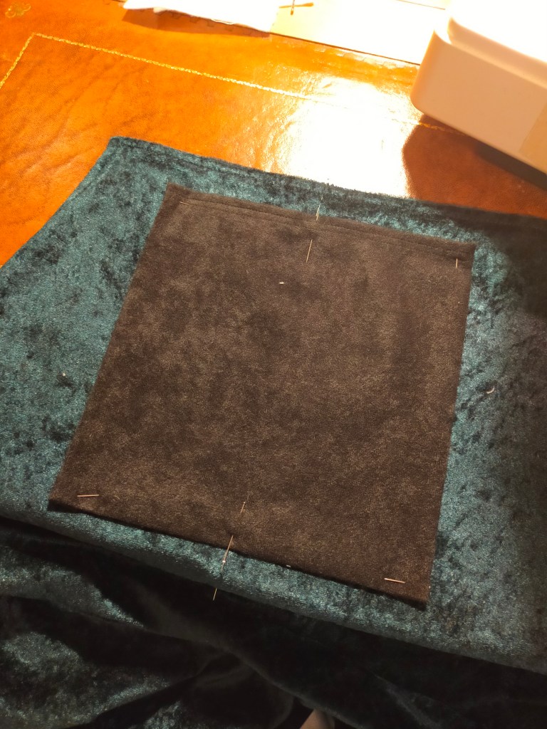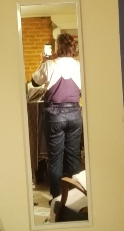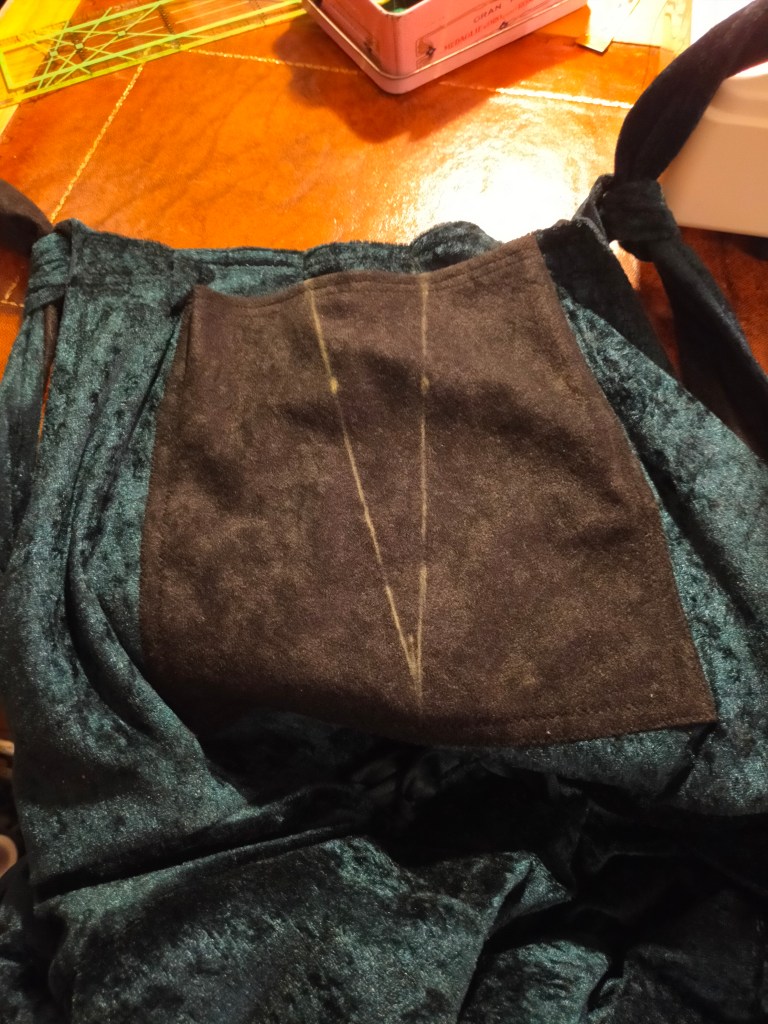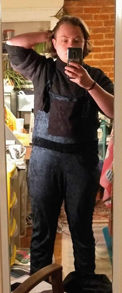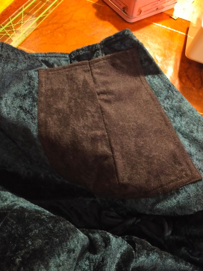 Over the next couple days I extended the legs and put the cuffs on, cut and sewed the bib and straps and loops and front pocket. The straps and loops are faced with the same material the pocket is made from, a black faux suede half yard I had knocking about, used for stability because it has very little stretch.