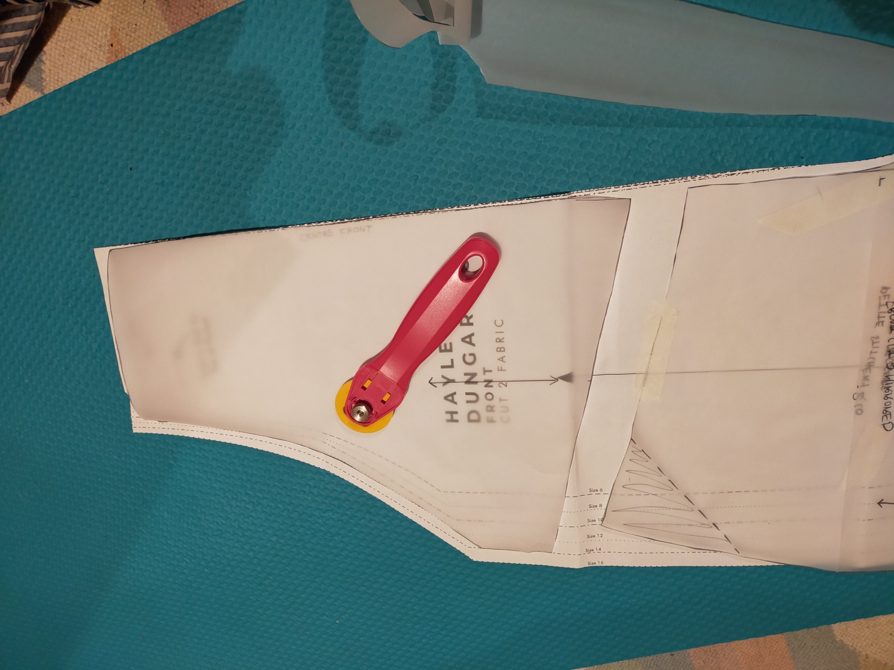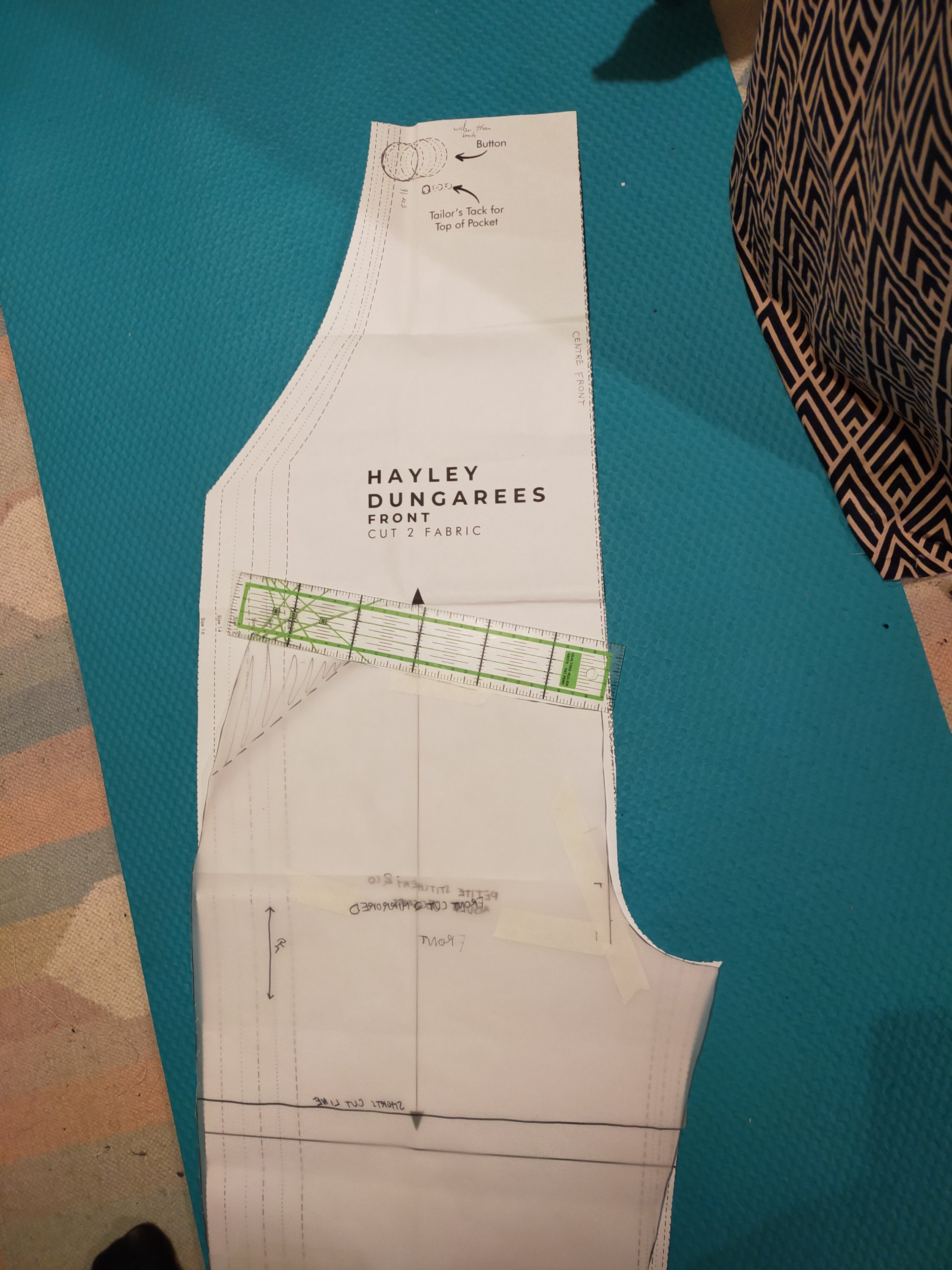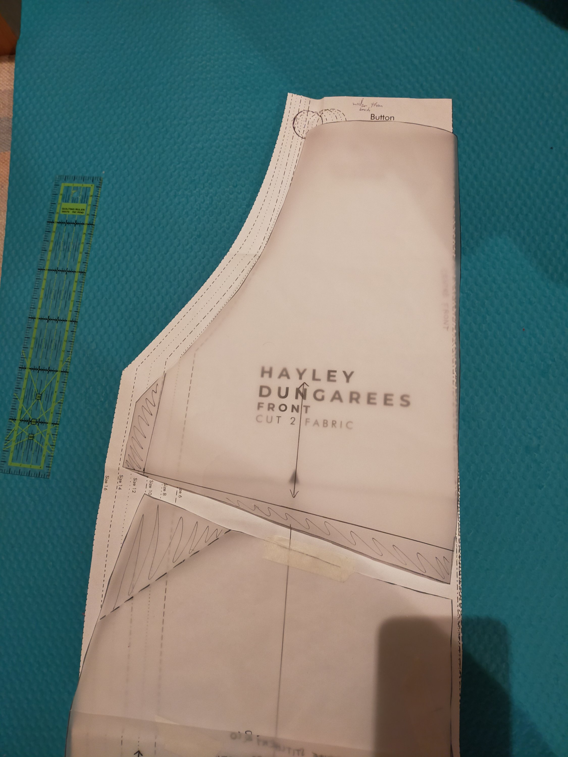 Leg-fitting obsession aside, I turned my attention to finagling these into dungarees. I dug out my Hayley dungarees pattern pieces and lay the joggers patterns over them, lining up by the grainline and the crotch curve. The fronts made it pretty clear why I had so much fabric spare in the front rise/tummy of the Hayley’s – there’s essentially a big spare triangle of fabric there, as there’s no shaping through the waist and no waist suppression or anything like that. Not pictured, but the Hayley legs are also wider and shorter than the joggers, which explains why they came out so wide and short on me. Genius epiphanies over here folks.