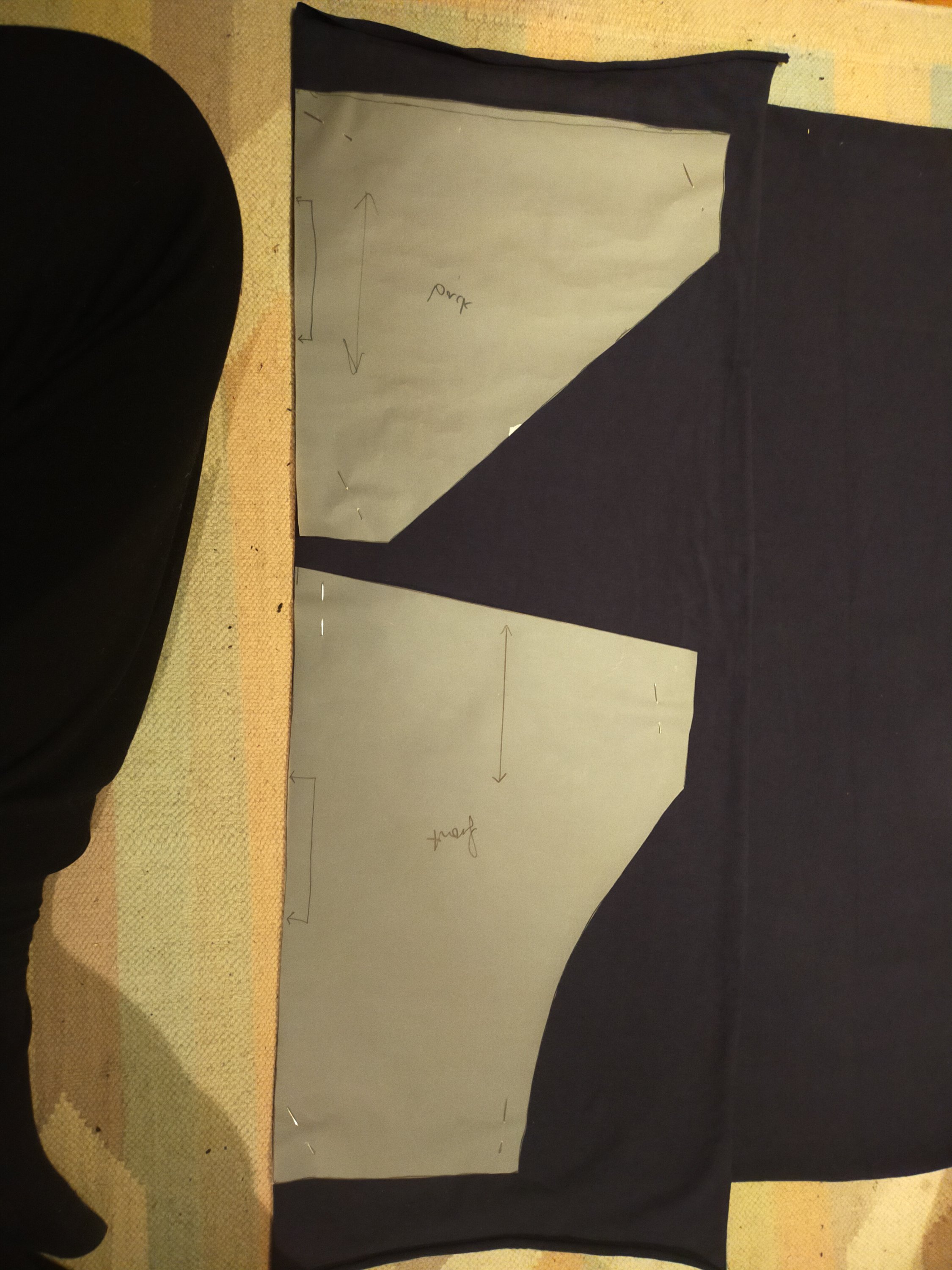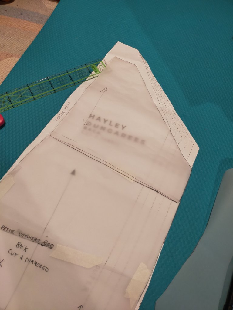 Then I traced off a back bib piece; there was no triangle or excess width to shave off here (suspicious again – why did the Hayley’s have so much room across the front?), but I did take a very slim concave curve off the bottom to match the convex curve of the tops of the joggers. Don’t know why really.
