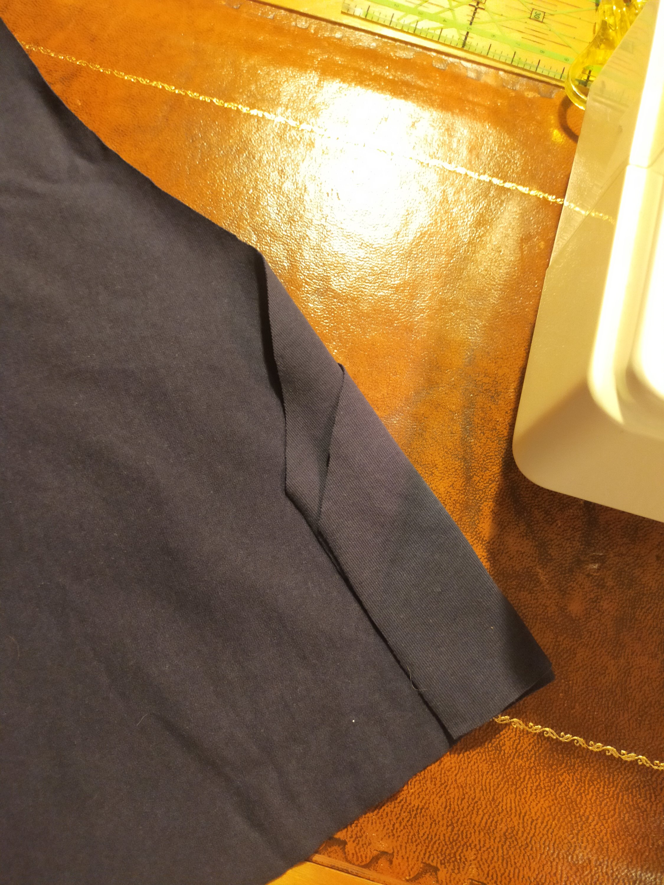 Marking off 2″ (ruler width) off the top of the joggers to fill in the waistband, I traced out a piece for the top bib piece. Based on the size 14, cos the size 16 I made before was large. Then I tried tissue fitting that, by which I mean I recalled the 10 pages of Palmer-Pletsch I read 3 months ago, held it up against my center line, and said ‘hm’. Then I shaved off a wedge measuring 1″ at CF as it was giving me a very steep triangle in the front and I didn’t want to replicate the same issue I had before, and trimmed off about an inch at the side seam to bring the bottom edge length in line with the top edge length of the legs pattern piece. The Hayley’s were ROOMY and not designed for stretch knit, so I’m not worried about that lost room. I’ll cut the facing first so I can baste and be suspicious about that triangle in CF.