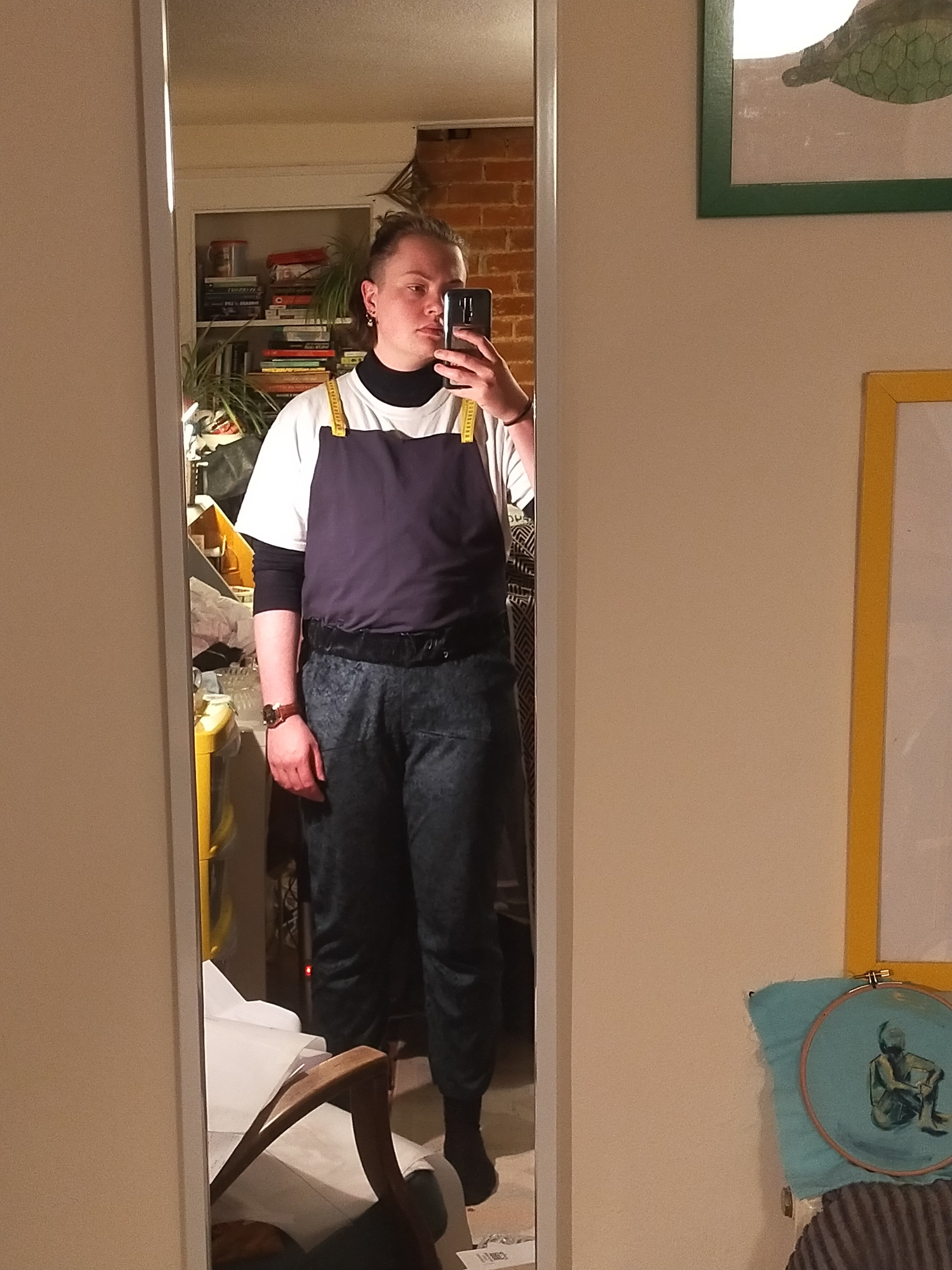 I think as dungarees I will want to wear the waistband slightly higher, so mental note to increase the elastic to 38″ or 38.5″. Then I slept on it (again).