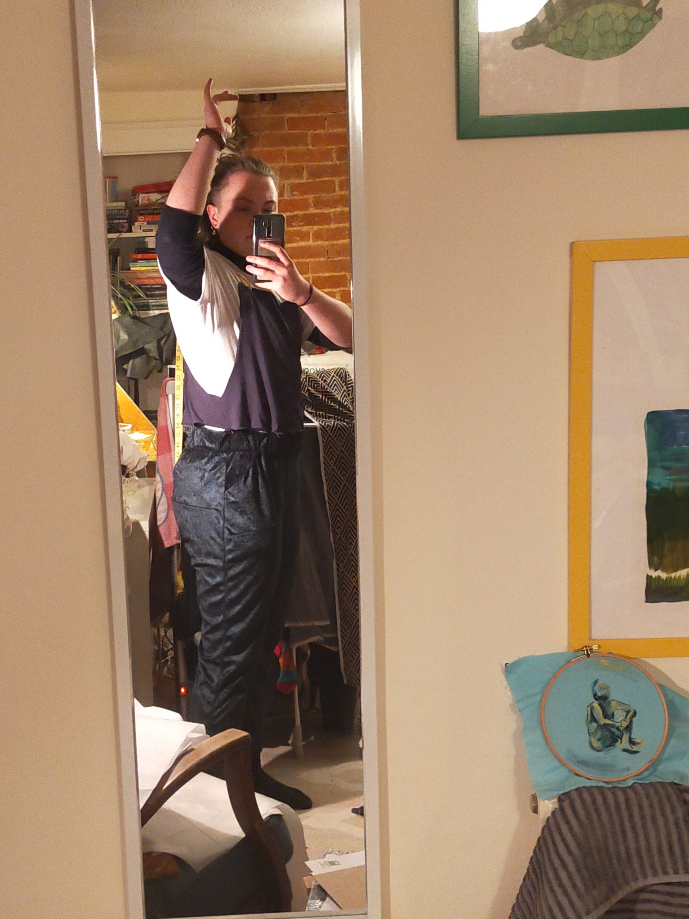 Then I tried them on and wandered about a bit and found the top or sides were gaping a bit, with too much room in the chest. I thought about darting it out on the side or at the side seam, but ultimately thought it would be more hidden by the pocket, and was curious whether the top would benefit from losing some width anyway. I shot that last bit in the foot when I didn’t bother to remove and restitch the pocket and instead just put a big long dart in it with a ladder stitch.