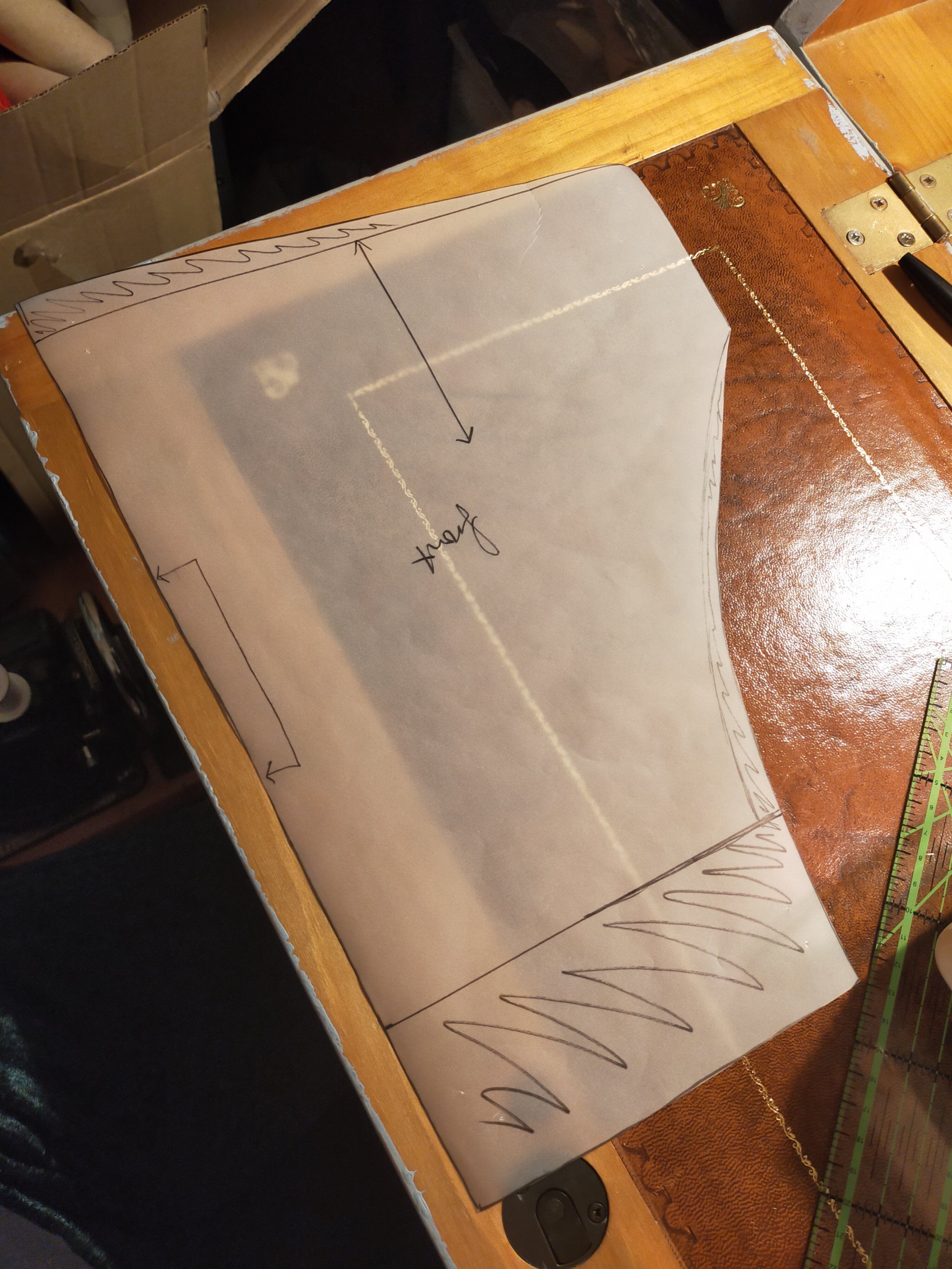 Fit notes to try on next set: an inch darted vertically out of the top of the front leg pattern pieces, tapering to nothing at the thigh (on a level just above the crotch curve rounds in); 1.5″ out of front rise and 1″ out of back; see if crotch needs lengthening. See if even more wants to come out of front rise, once those weird seams are out of the way. Maybe try a couple shorts pairs?