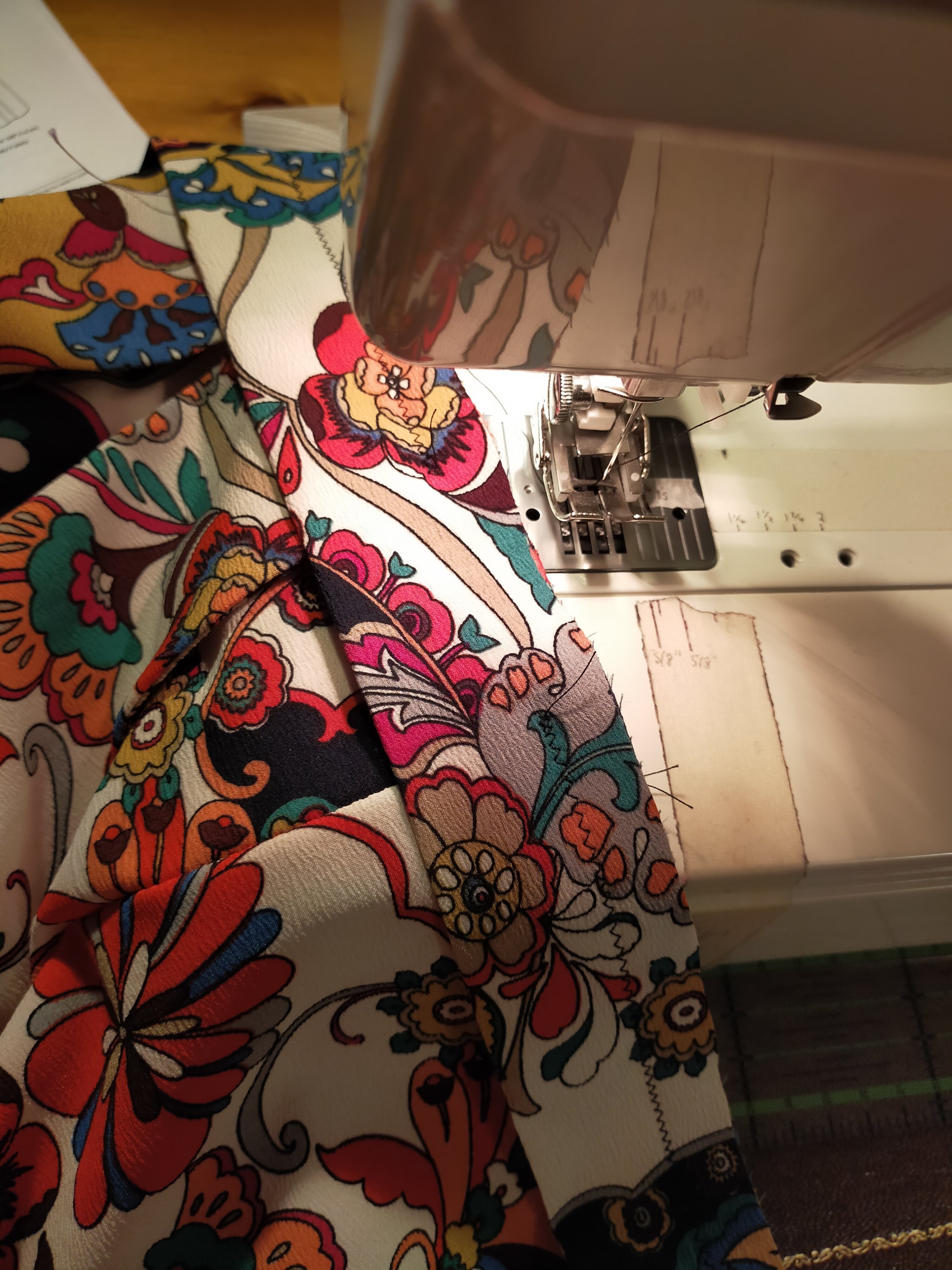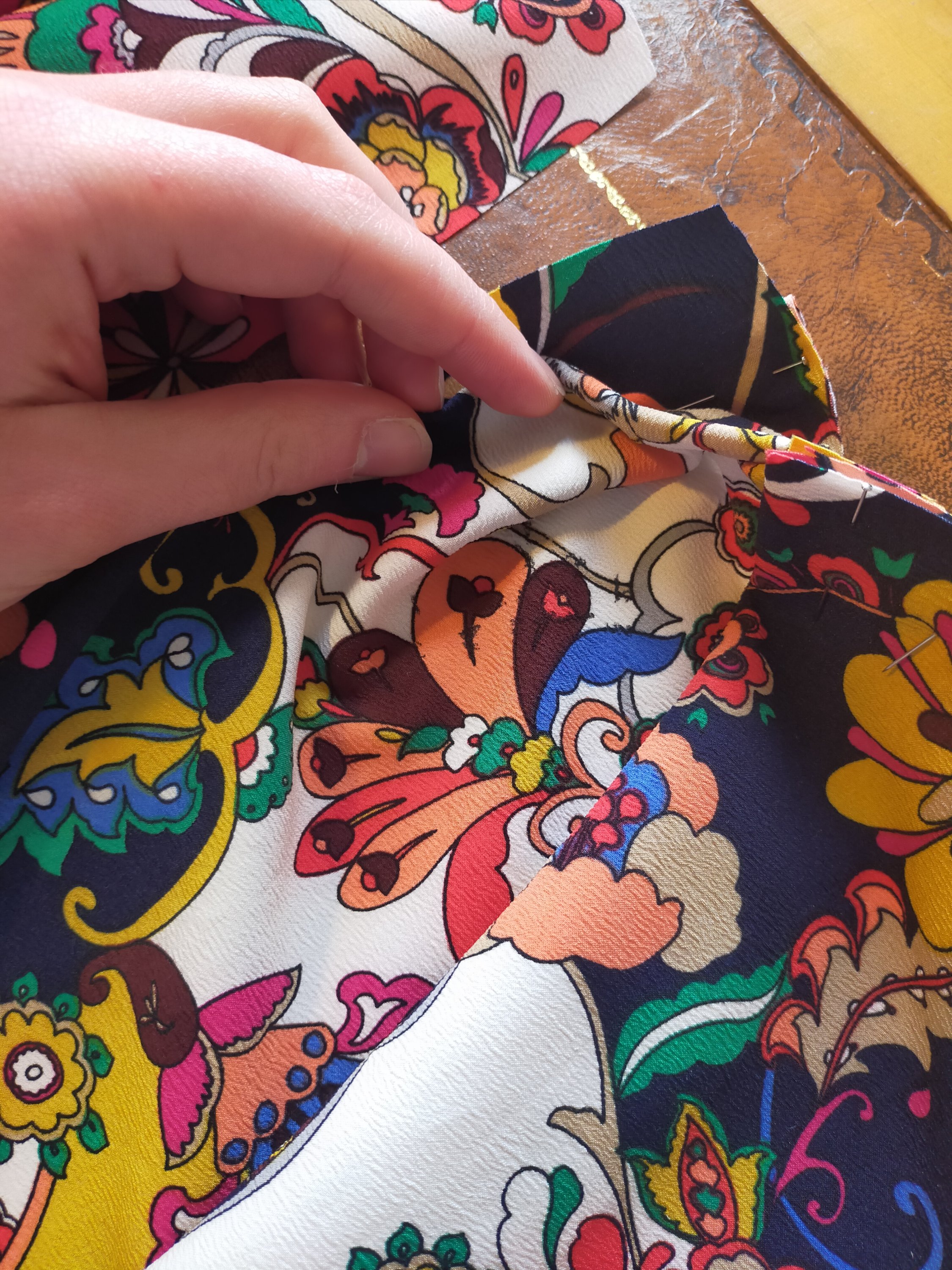 I didn’t bother with pattern placement at all – I had so little fabric, and still so little experience, I wanted to keep it easy and let myself off. Despite my irreverence, the sewing gods smiled on me and hid this one mistake in the print (that I hadn’t noticed!) neatly inside the very top of one of the pleats, where I’d bet it’ll never get noticed. Until I point it out because I’m so pleased.