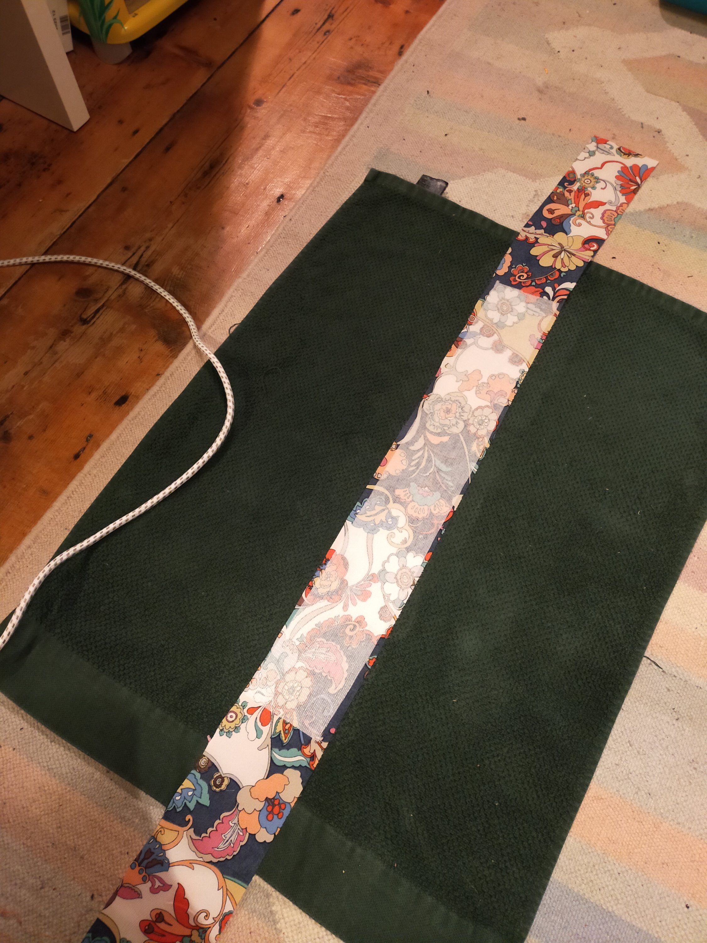 The front of the waistband, with an inch overlap beyond each side seam, is interfaced. When sewing it on, a 2″ gap was left just in front of each side seam, for insertion of the back elastic. Which was then secured with lines of vertical stitching in line with the side seam.
