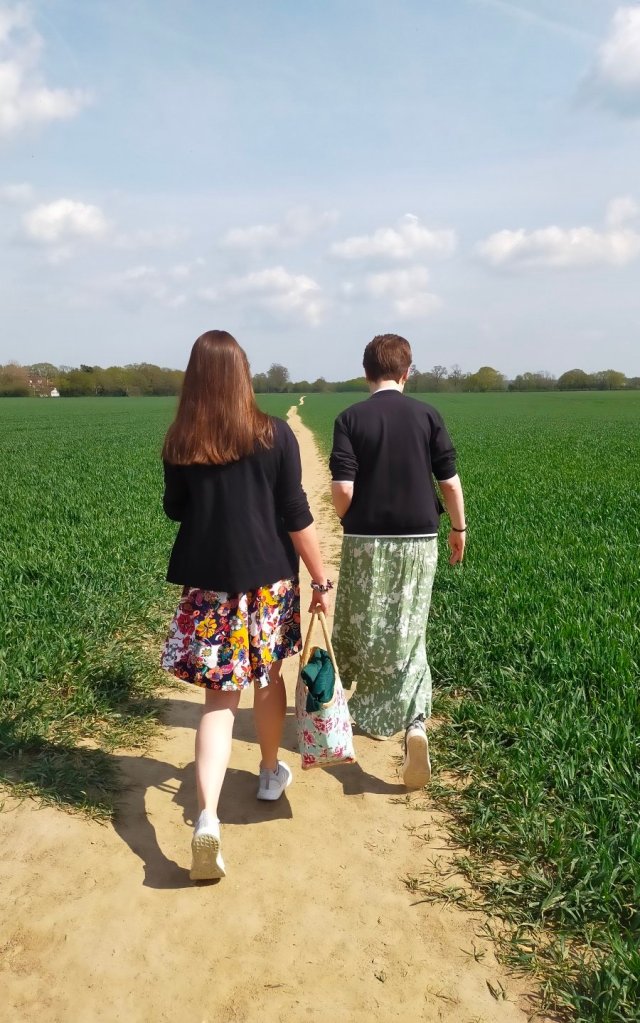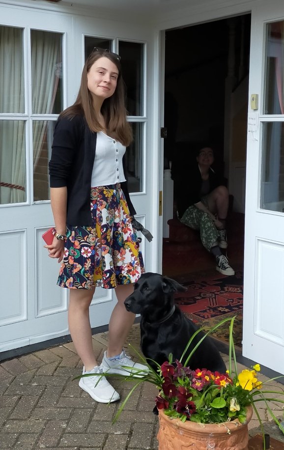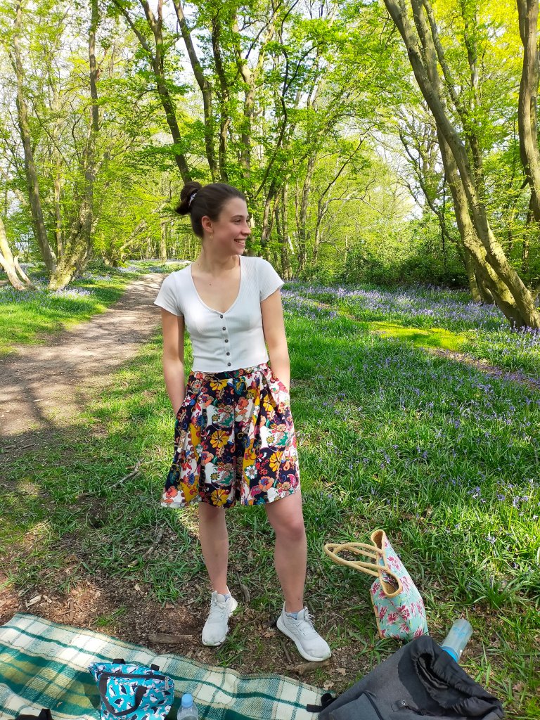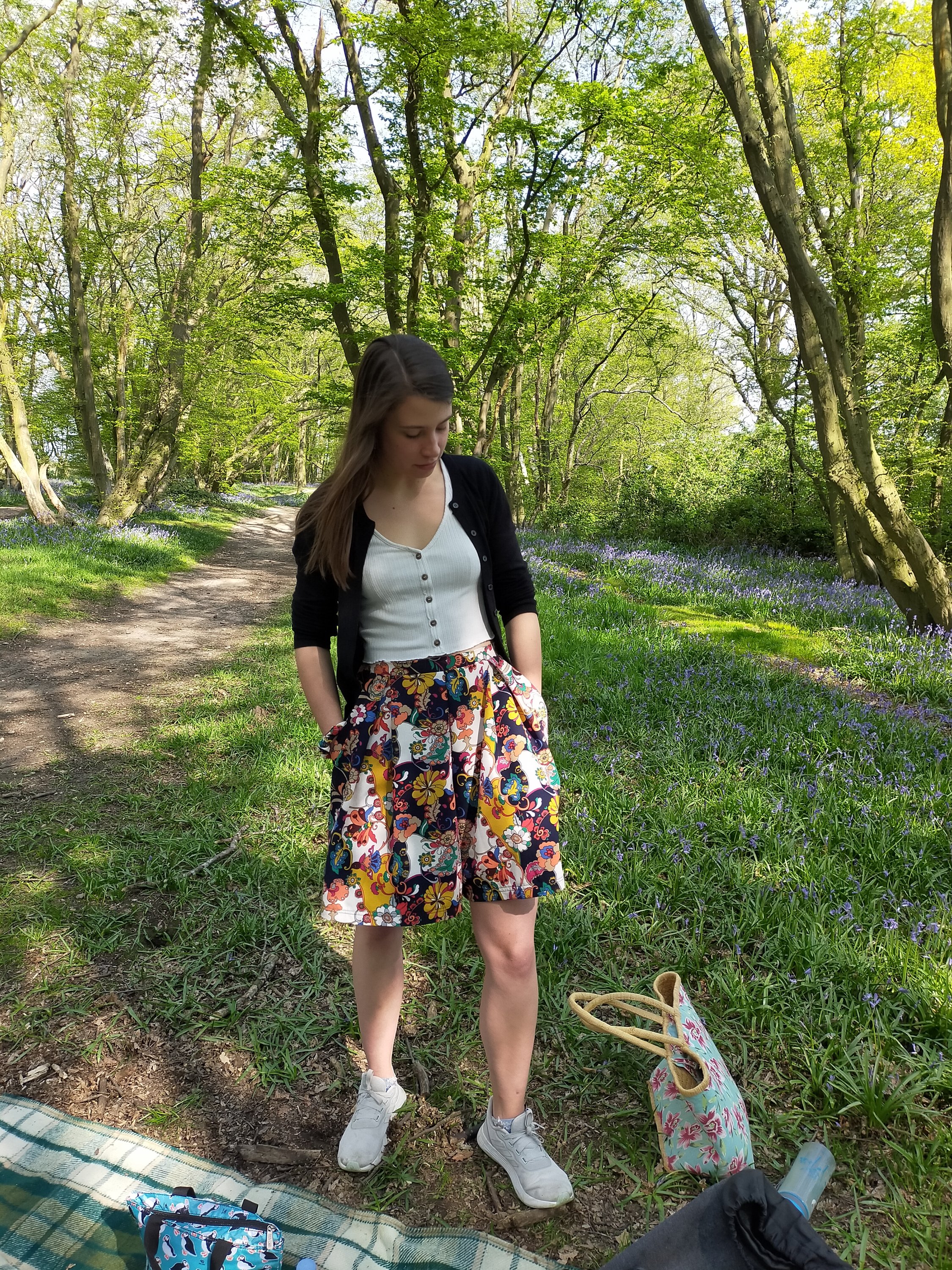 You can see slightly more side view below, or at least a bit more of how the hem hangs. The dog and the flowers are of course essential props, the child in the background was just lucky timing.
