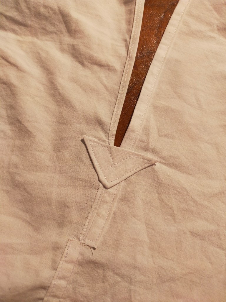 Post-humously put slits into the side seams, as I didn’t want to put pockets in the shirt but wanted to be able to reach my trouser pockets. Undid the side seams 7” up, unpicked the flat fell to 2” above that, pressed the seam allowance open, double folded each side under itself and stitched down. The bedsheet was worn and ripped easily under pressure so I then added a little triangle to the top of each slit for strength and to distribute the weight on the fabric.