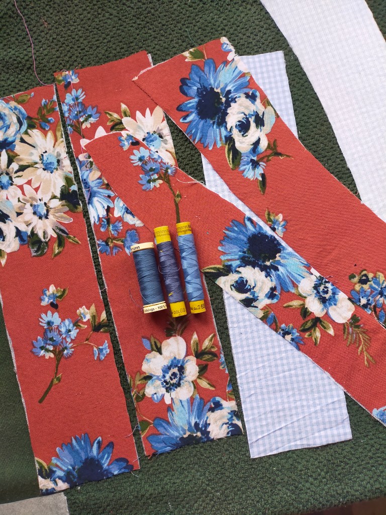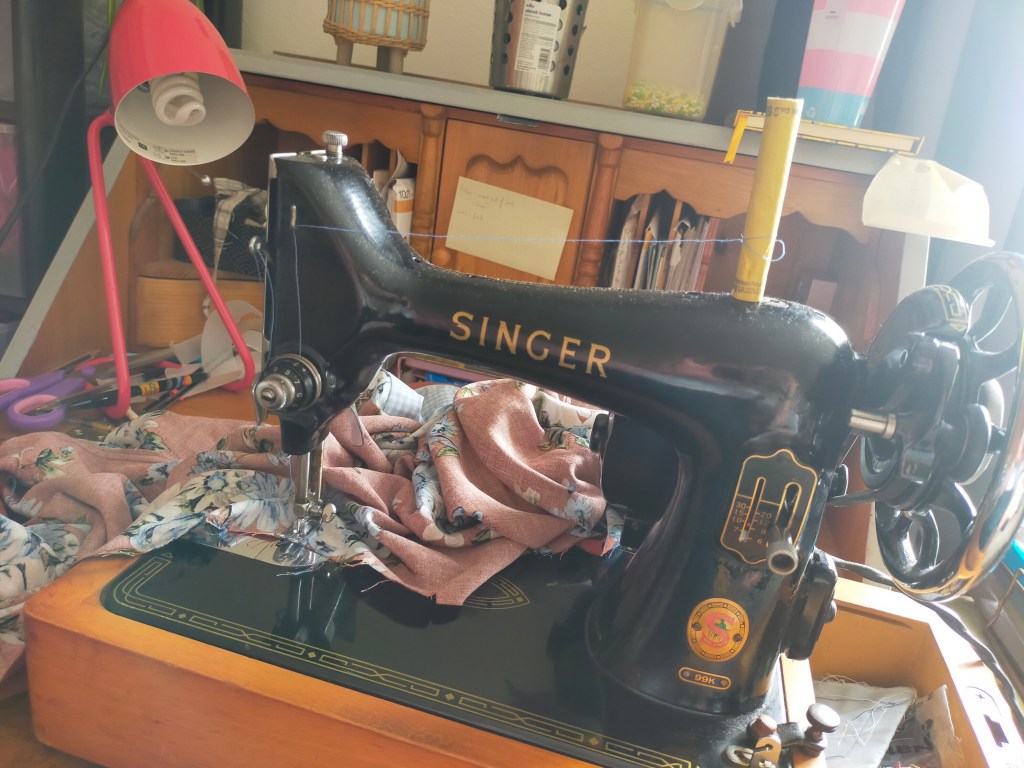 I cut the inner yoke, cuffs, collarband, and under collar from a blue gingham cotton for stability and I was extremely glad I did, as the printed viscose was very shifty for me, and was very happy to stretch itself out of grain/shape. I also sewed this whole shirt (except buttonholes) on my Nana’s Singer 99K which was super fun. I didn’t have a terracotta thread in stash and I wanted to bring out the blues from the palette so I used a couple blue threads from her stash too. The gingham helped with the blue too, and with avoiding the floral viscose showing through itself. The assortment of mismatched blue buttons are from my own hoard of trinkets.