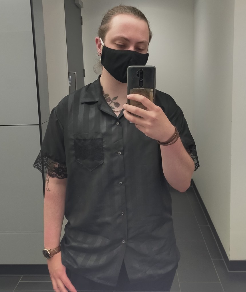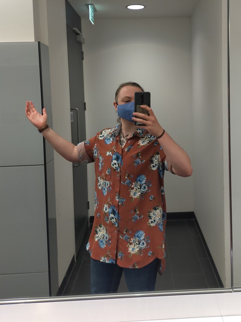 All my alterations are adding up to a great shirt now, but I’m still having a suspicious time with the hem length. Not sure if I’m overthinking it, but I’m struggling to locate the ideal spot for the hem to hit, in terms of gender. Does the single perfect length exist, that could be short enough to be oversized or just tunic-y on masc days, but long enough to be decent over bike shorts or leggings on fem days? I actually suspect that the step difference between front and back is not working for this. If/when I give it a fourth shot, I think the front can be lengthened 1-2” and maybe the scoop of back shortened a bit. Maybe it’s a lost cause to try to find one garment that can fluidly adapt depending the gender mood, and it would always be a bit uncomfortable and stuck in the middle. The front length does seem to be good to steal for an oversized t shirt.