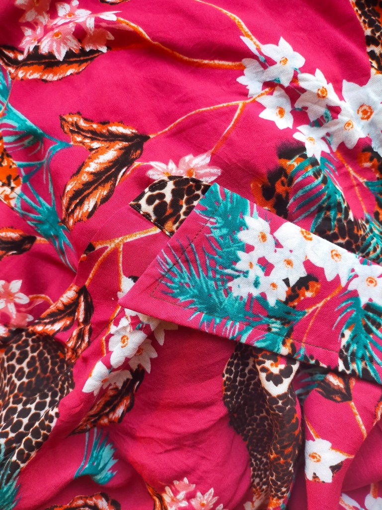 I cut the inner yoke from the same gingham, but the inner cuffs, collarband, and collar from this great and super saturated tiger-jungle print quilting cotton. I couldn’t put the fat quarter down when I came across it in hobby craft, and once I got it home this fabric combo was just calling my name. It makes me laugh every time I look at it, I love it so much.